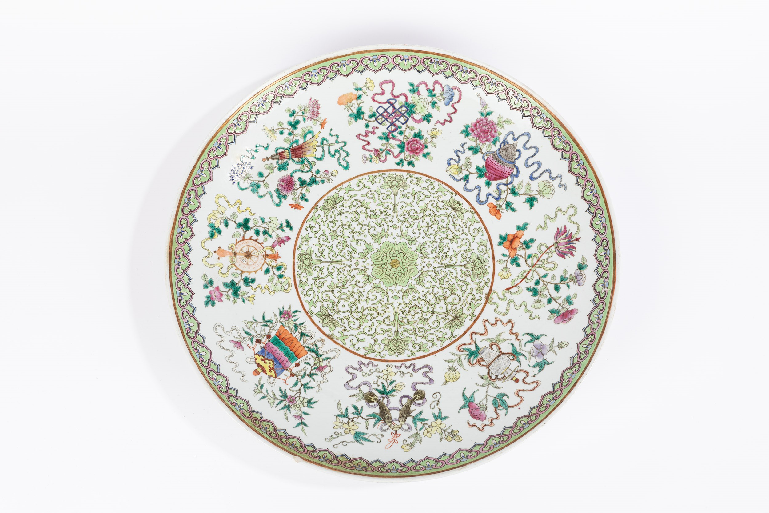 in porcellana famiglia rosa, decorato a motivi floreali in smalto verde lime, la tesa decorata con gli otto simboli Buddhisti