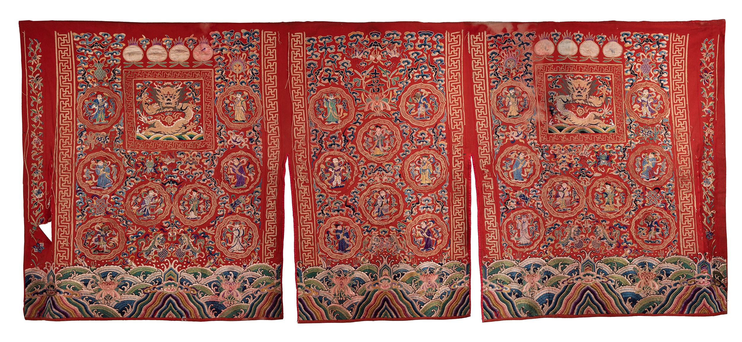 riccamente ricamato in policromia a motivi floreali con figure di Immortali