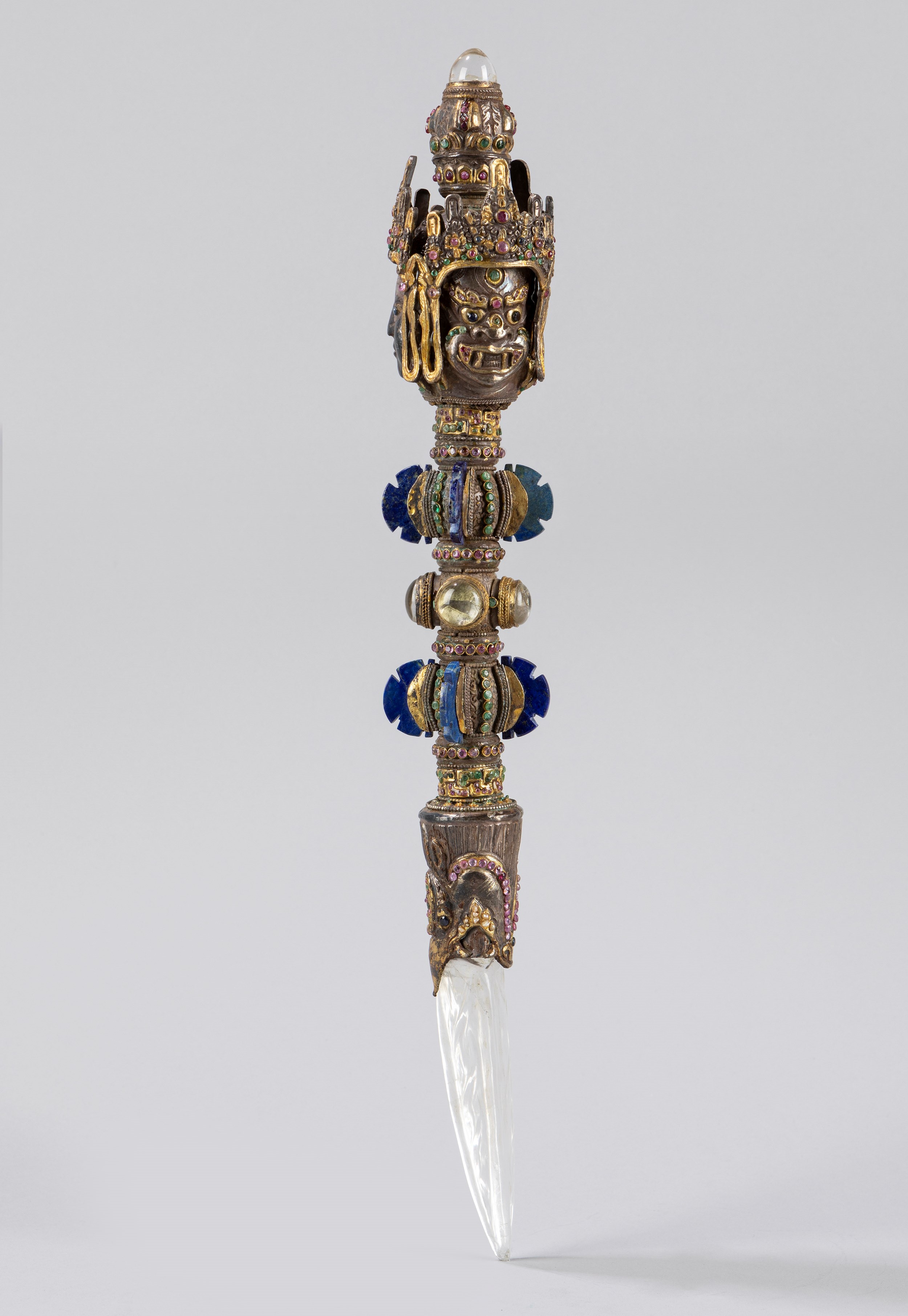 Phurba in lamina di argento e metallo dorato. Tibet/Nepal, secolo XIX