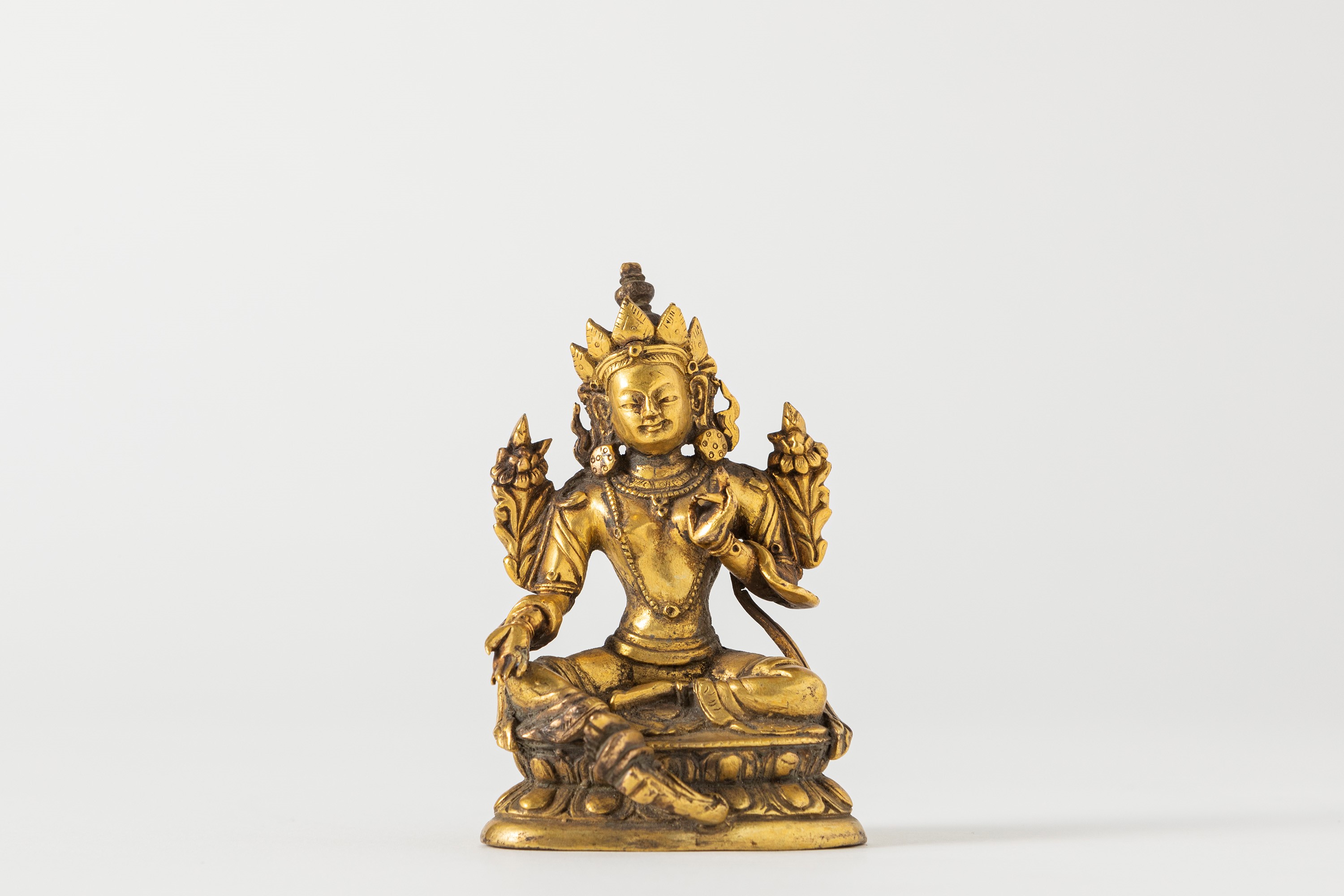 Piccola scultura in bronzo dorato raffigurante Tara verde. Tibet, secolo XIX