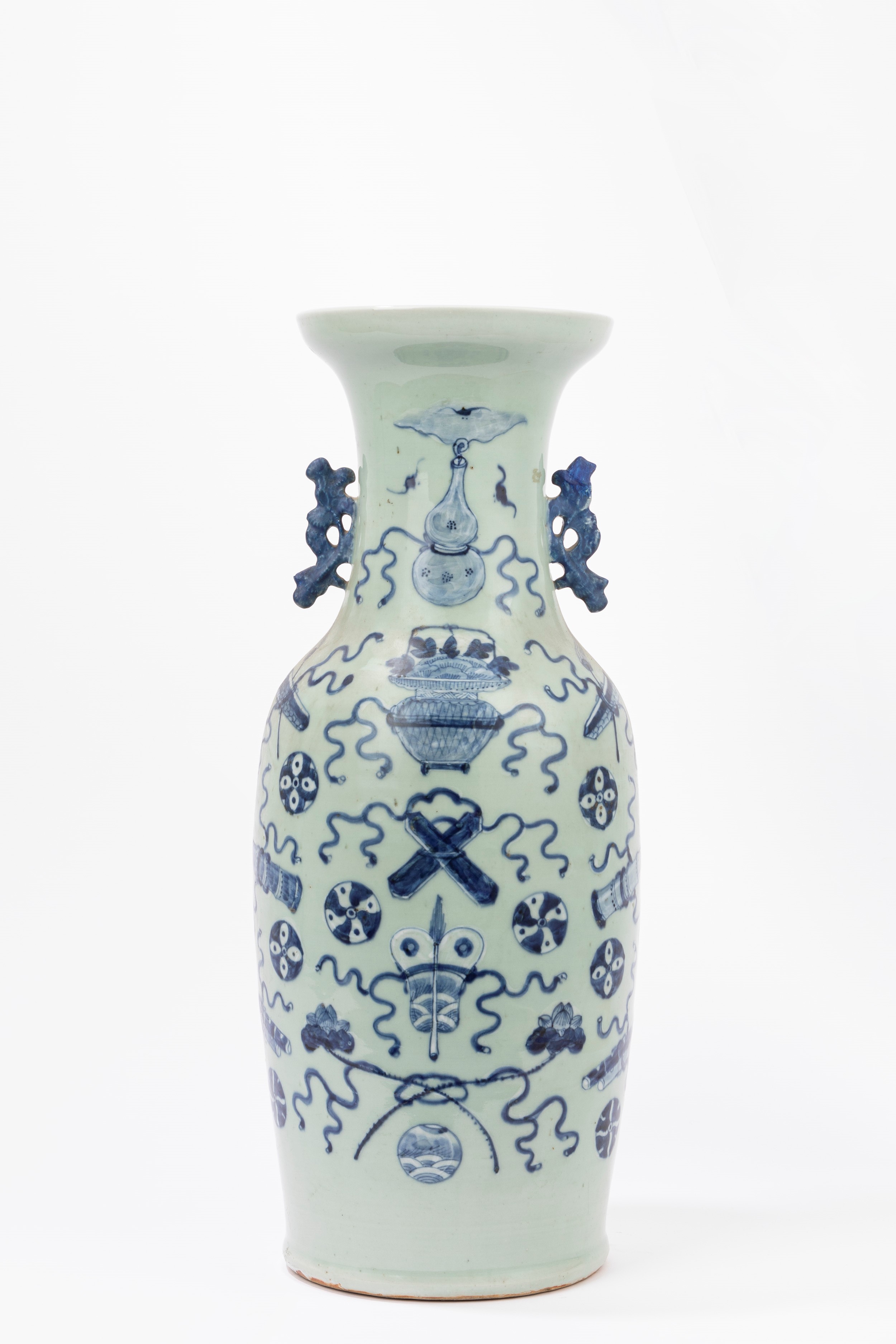 Vaso in porcellana a fondo celadon e decori blu. Cina, fine dinastia Qing