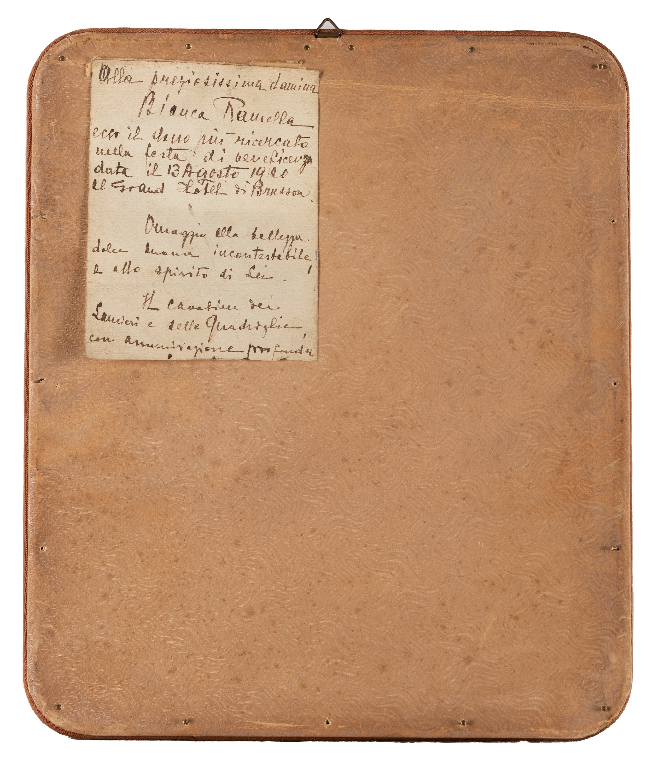 Sul retro della cornice cartiglio con dedica: Alla preziosissima damina / Bianca Ramella / ecco il dono più ricercato / nella festa di beneficenza / data il 13 agosto 1920 / il gran hotel di Brusson. / Omaggio alla bellezza / dolce buona incontestabile / e allo spirito di Lei. / Il cavaliere dei / Lanceri e delle Quadriglie / con ammirazione profonda.