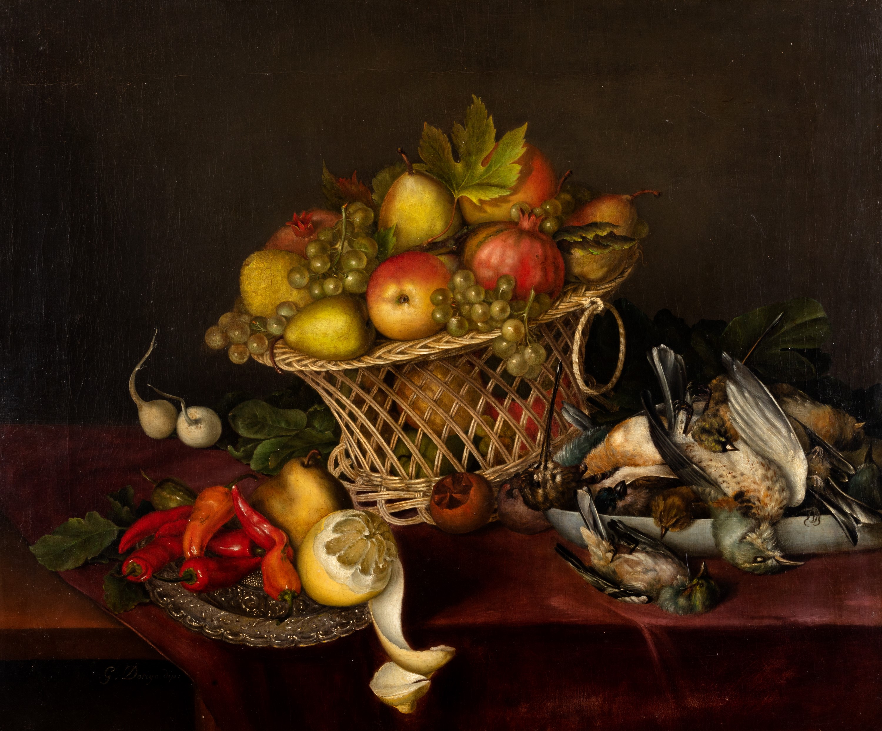 Natura morta con peperoncini, limone, cesto di frutta e cacciagione