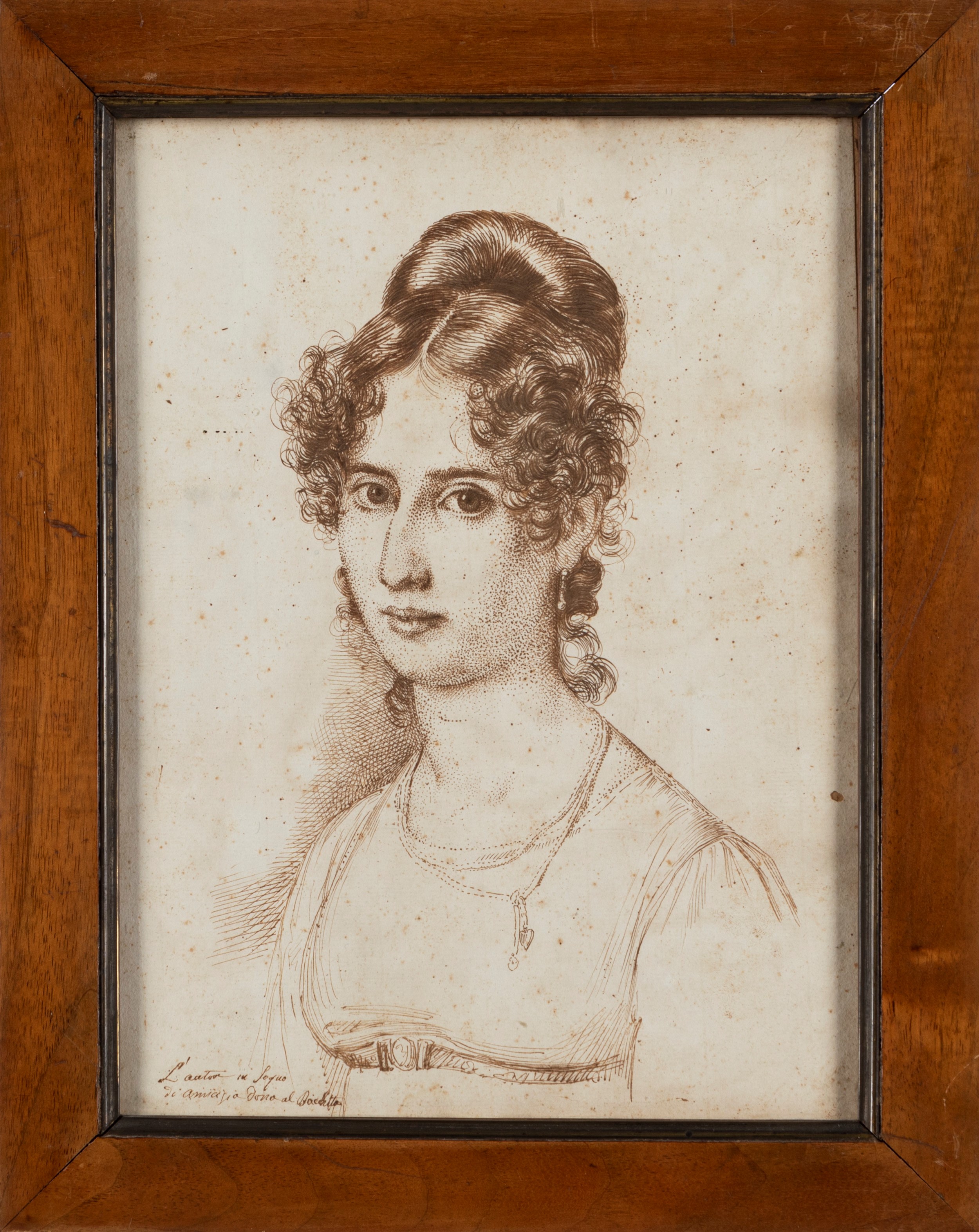 Sul retro, il ritratto femminile reca iscrizione: Sotto il giorno 14 ottobre 1822 / alle ore otto della sera di detto giorno / il suo praticante Cozzi Giò Batta in compagnia / della sig.ra Marietta De-Simoni Bacchetta di lui moglie / il sig Luigi Cozzi, che a giorni deve partire per le / montagne. Il sig Abbondio Bagutti pittore di (...) / il sig Ignazio Caccia nipote del suddetto sig Bacchetta / e le gentilissime di lui (...) Antonietta e Bianchina / Evviva / Salute, felicità, e figlivolanza.