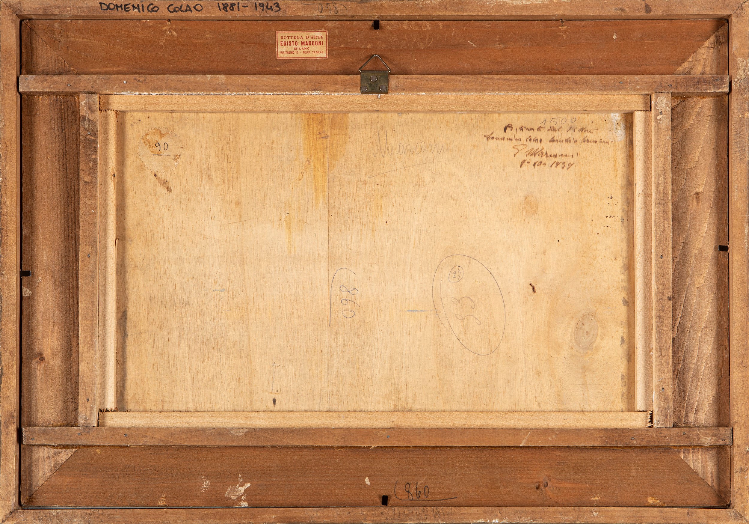 Sul retro iscrizione autografa di Egisto Marconi: ritirato dal pittore / Domenico Colao cambio cornici / E. Marconi / 9.10.1939