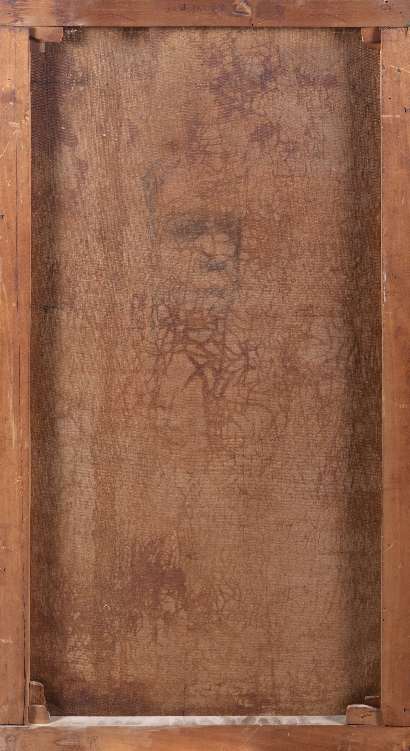 Sul retro, sul telaio, vecchio timbro e cartellino a stampa con numero di riferimento (45).