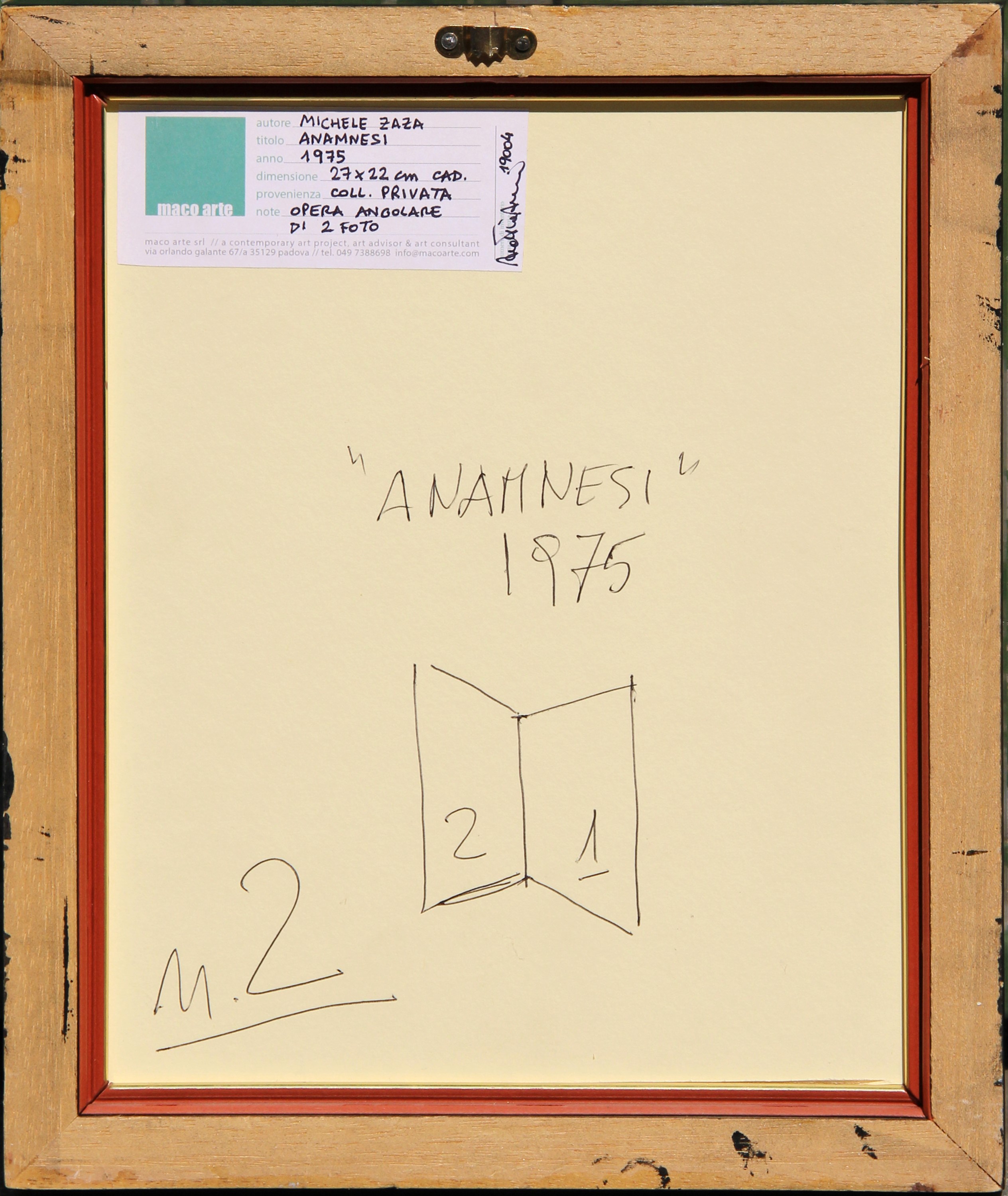 Titolo, data, descrizione, numerazione, firma Anamnesi, 1975, opera angolare di 2 foto, n.1, Michele Zaza (al retro)