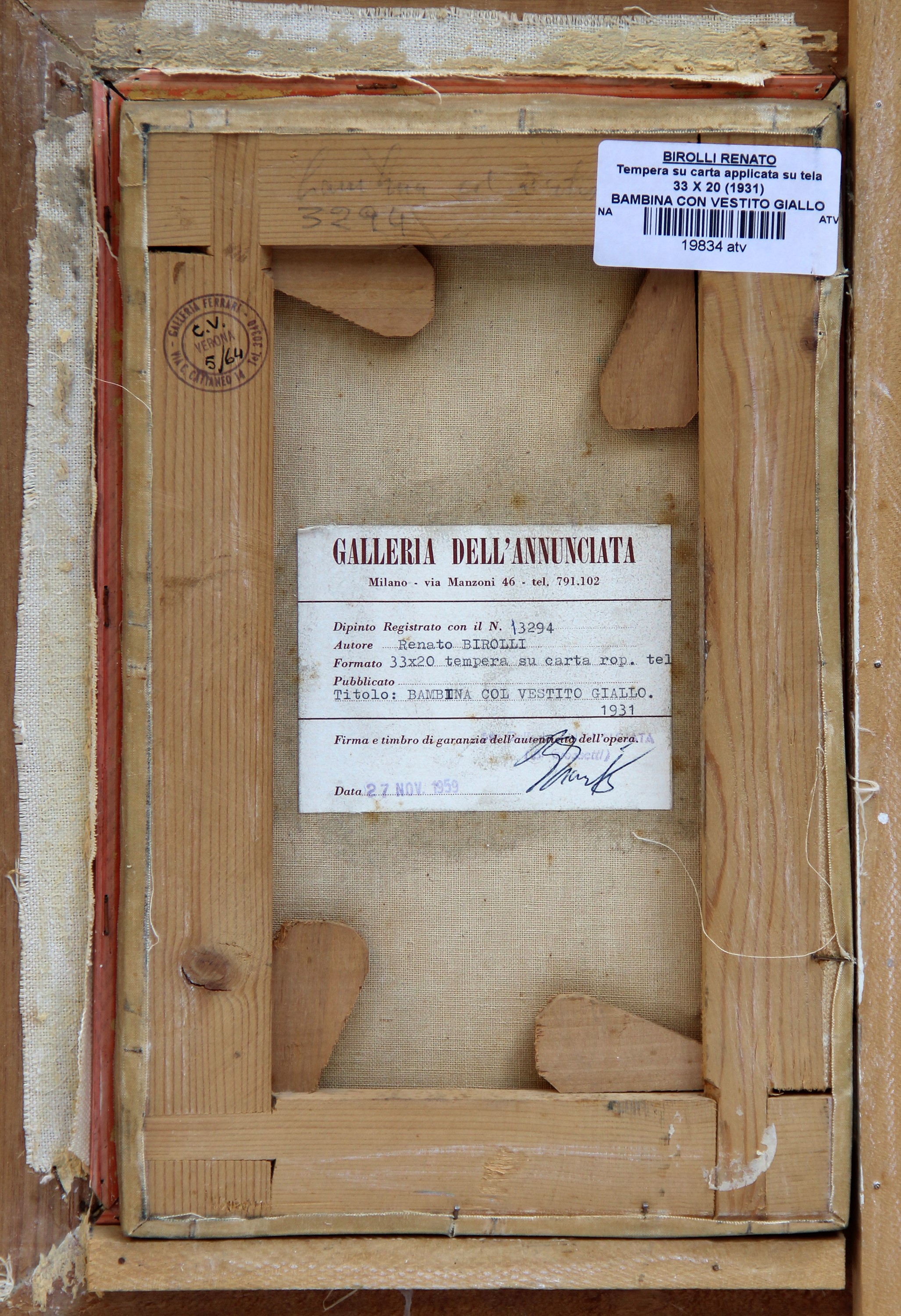 1931 Etichetta della Galleria dell'Annunciata, Milano;