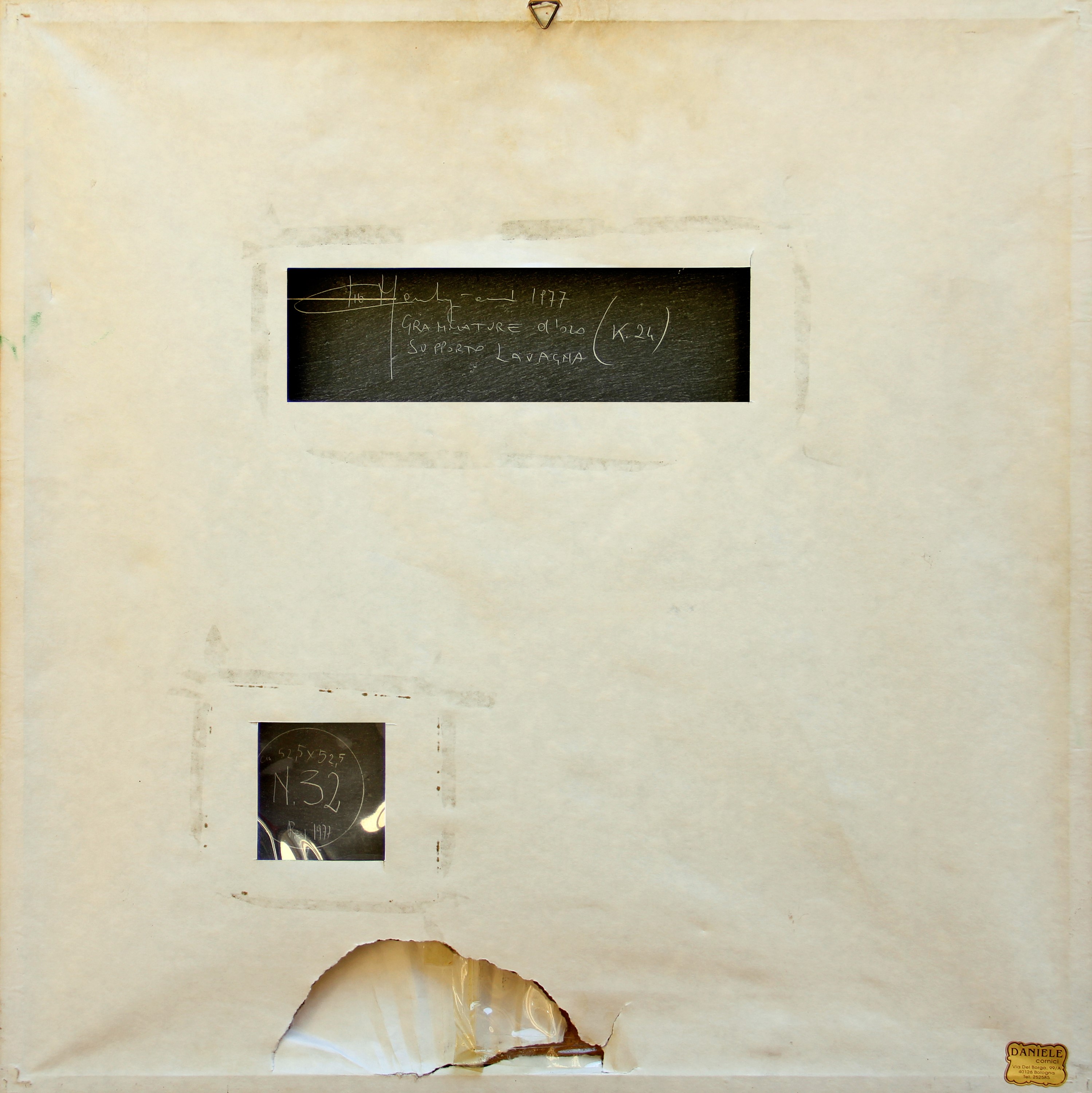1977 Firma, data, titolo, tecnica, misura, numerazione Elio Marchegiani, 1977, Grammature d'oro (K.24), supporto lavagna, cm 52,5x52,5, N. 32 Reg. 1977 (al retro)