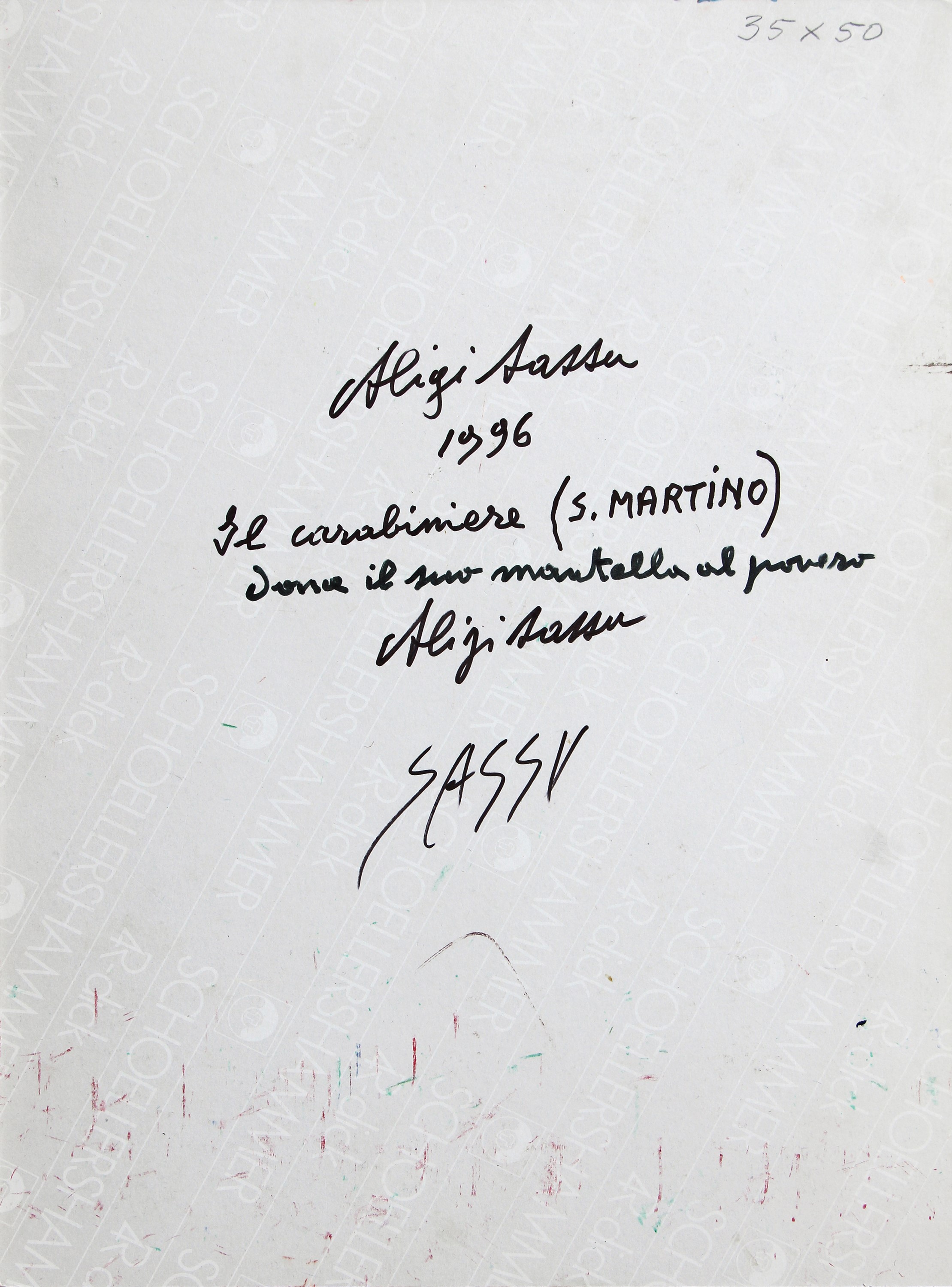 tecnica mista su cartoncino, cm 50x35 1996 Firma Sassu (in basso a destra) Firma, data, titolo, firma Aligi Sassu, 1996, Il cavaliere (S. Martino) dona il suo mantello al povero, Aligi Sassu (al retro)