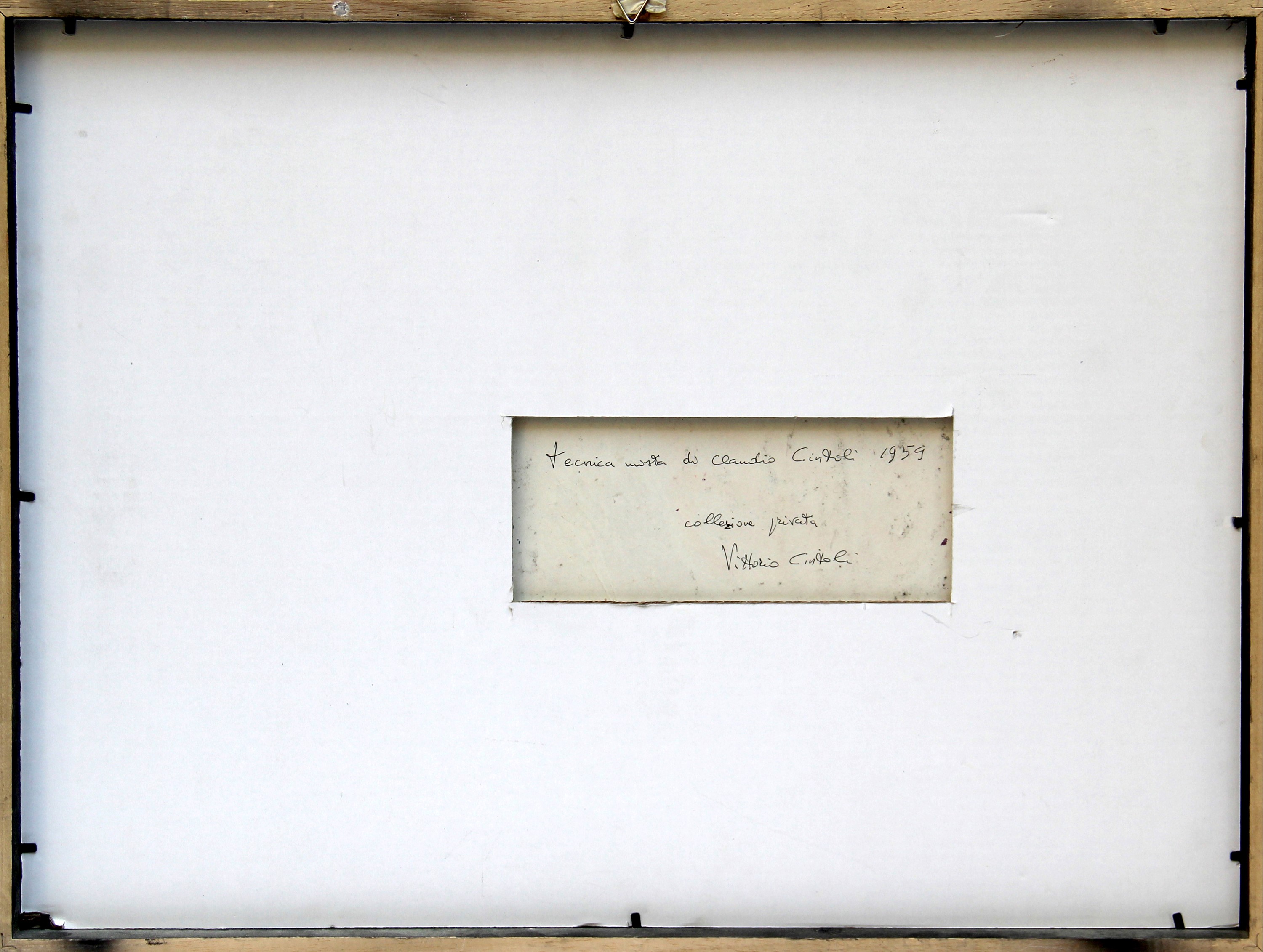 Firma, data Cintoli, 1959 (in basso a sinistra)Dichiarazione del fratello Vittorio Cintoli tecnica mista di Claudio Cintoli 1959, collezione privata, Vittorio Cintoli (al retro)
