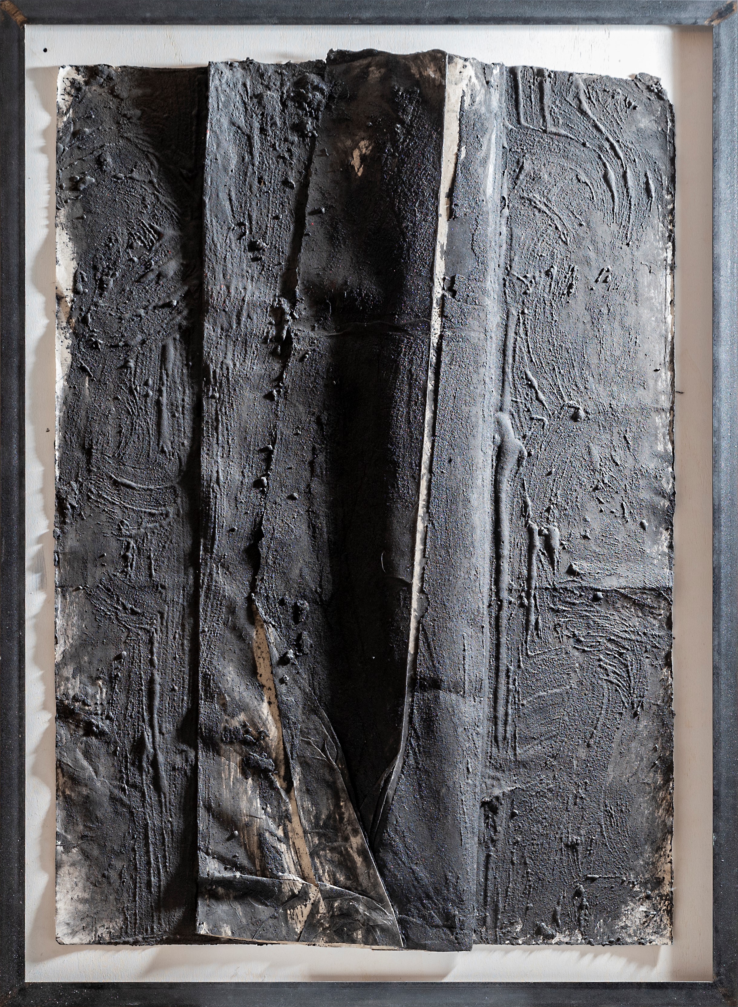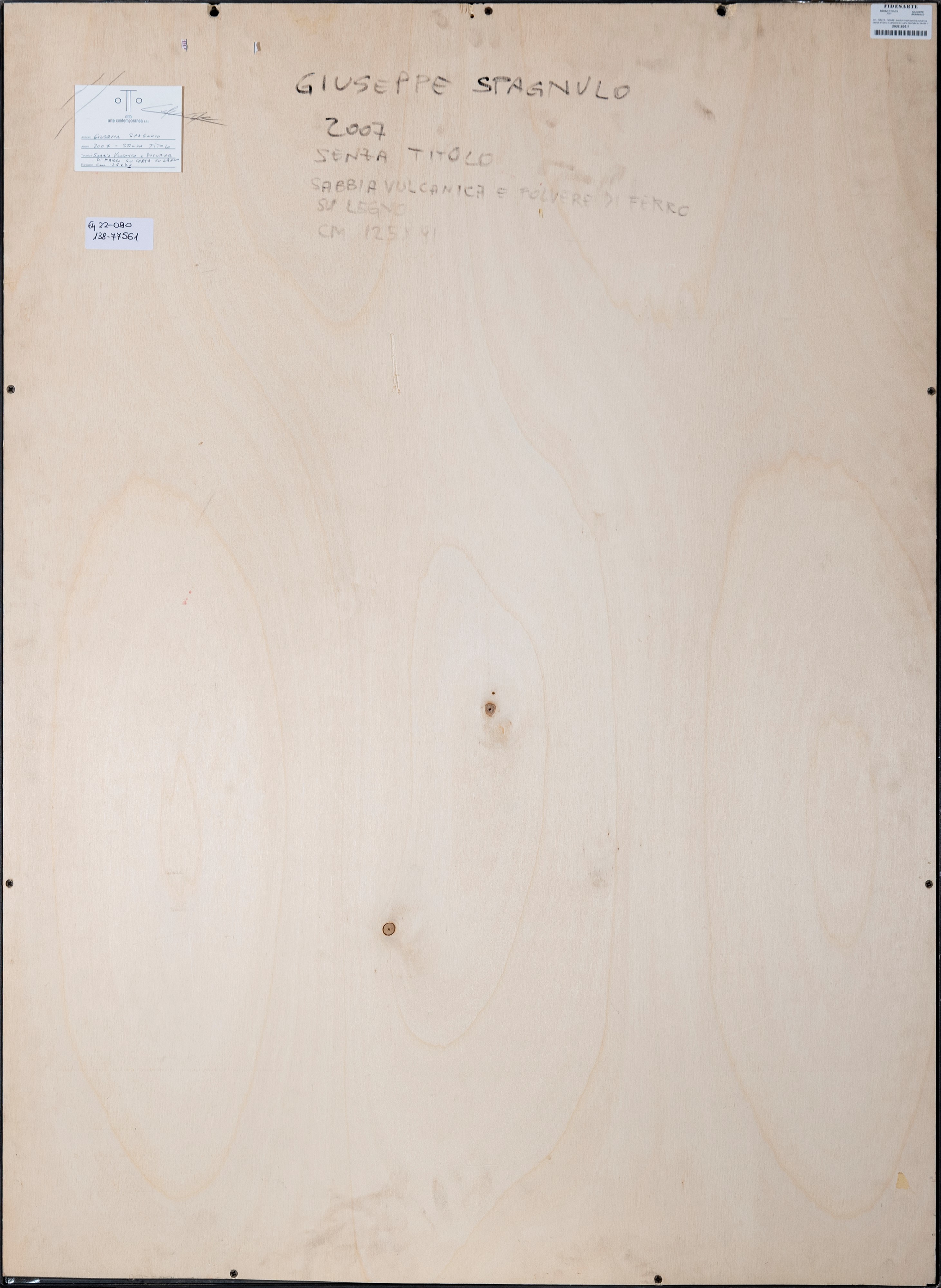 tecnica mista (sabbia vulcanica, ossido di ferro e carbone) su cartone e legno con cornice in ferro, cm. 106x75 - 120x88