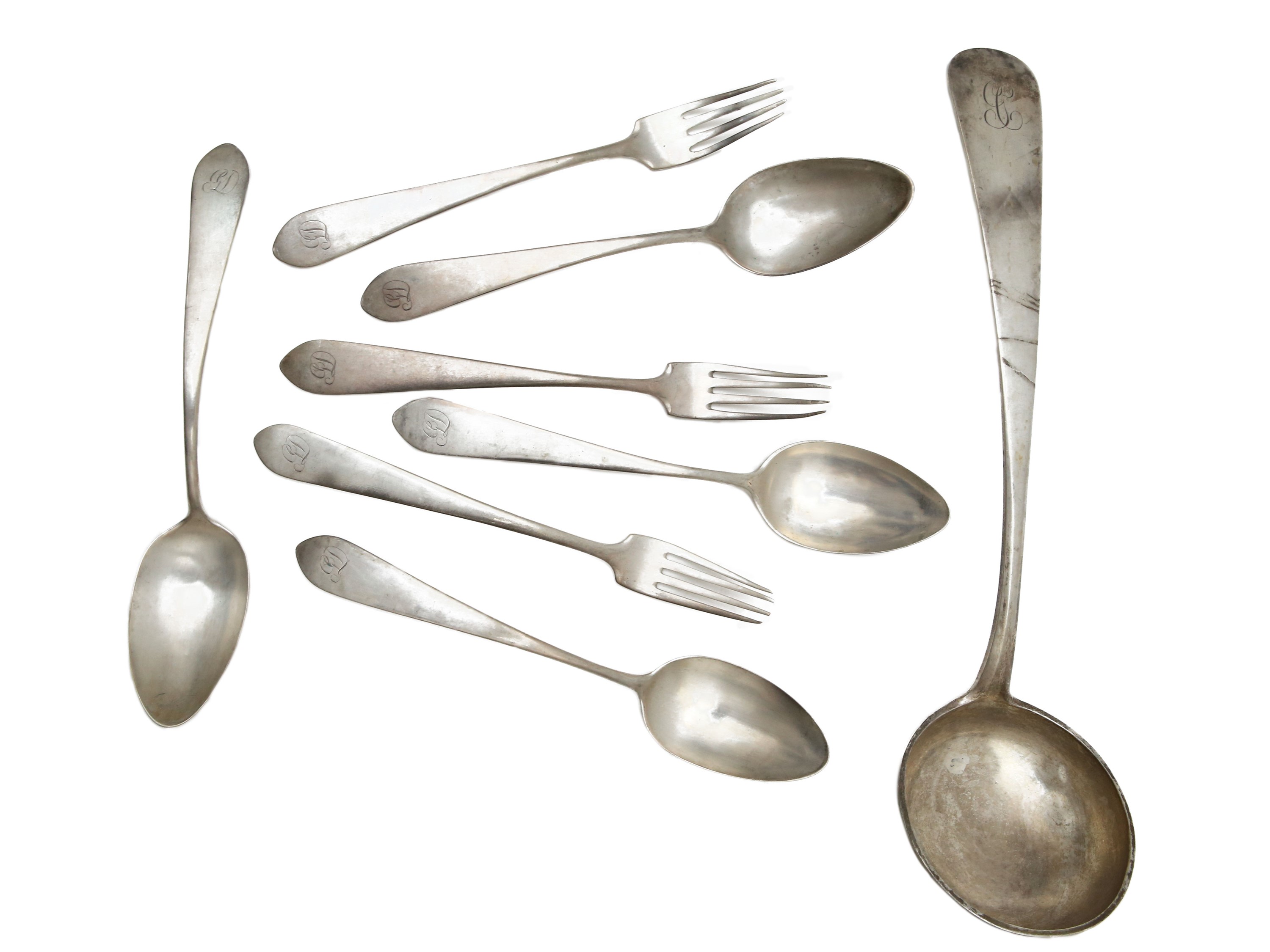 Italia, XIX secolo incise con il monogramma GD, composto da 3 forchette, 4 cucchiai ed un ramaiolo