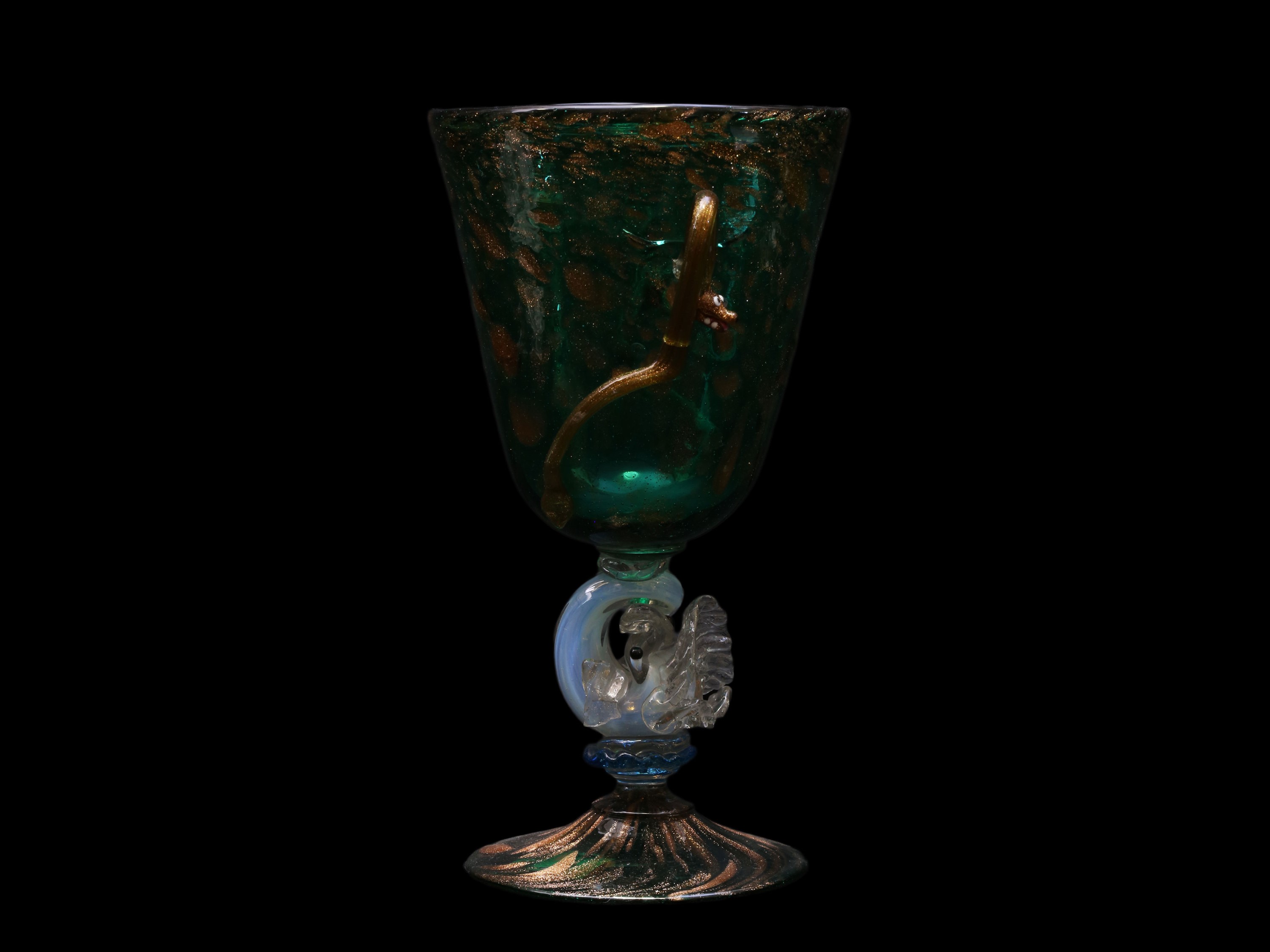 Murano, XX sec. con inclusioni di avventurina poggiante su delfino in vetro lattimo. Danno alla coppa e ad uno dei serpenti che fungono da manico.
