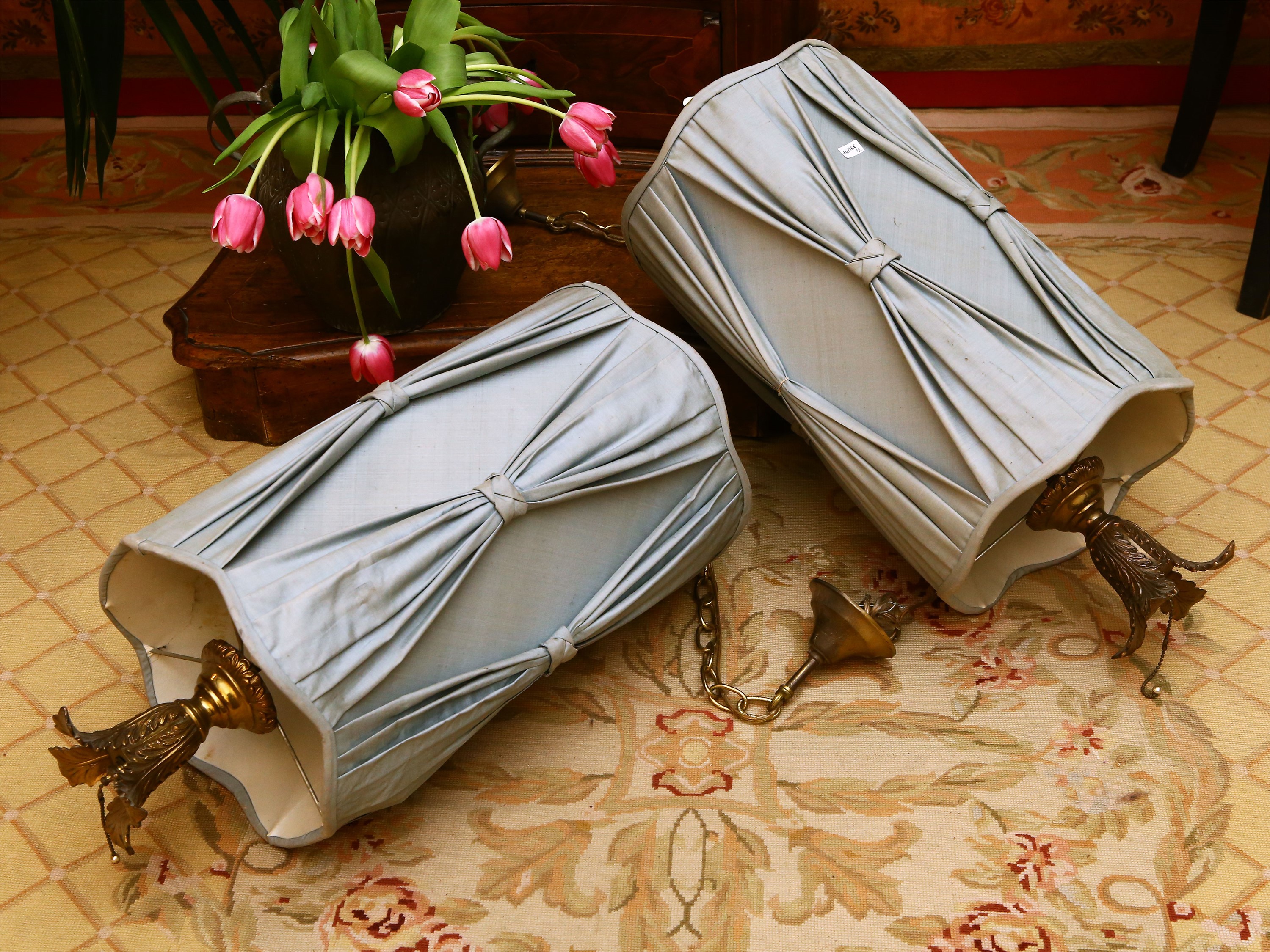 metà del XX secolo con paralumi cilindrici in tessuto celeste drappeggiato