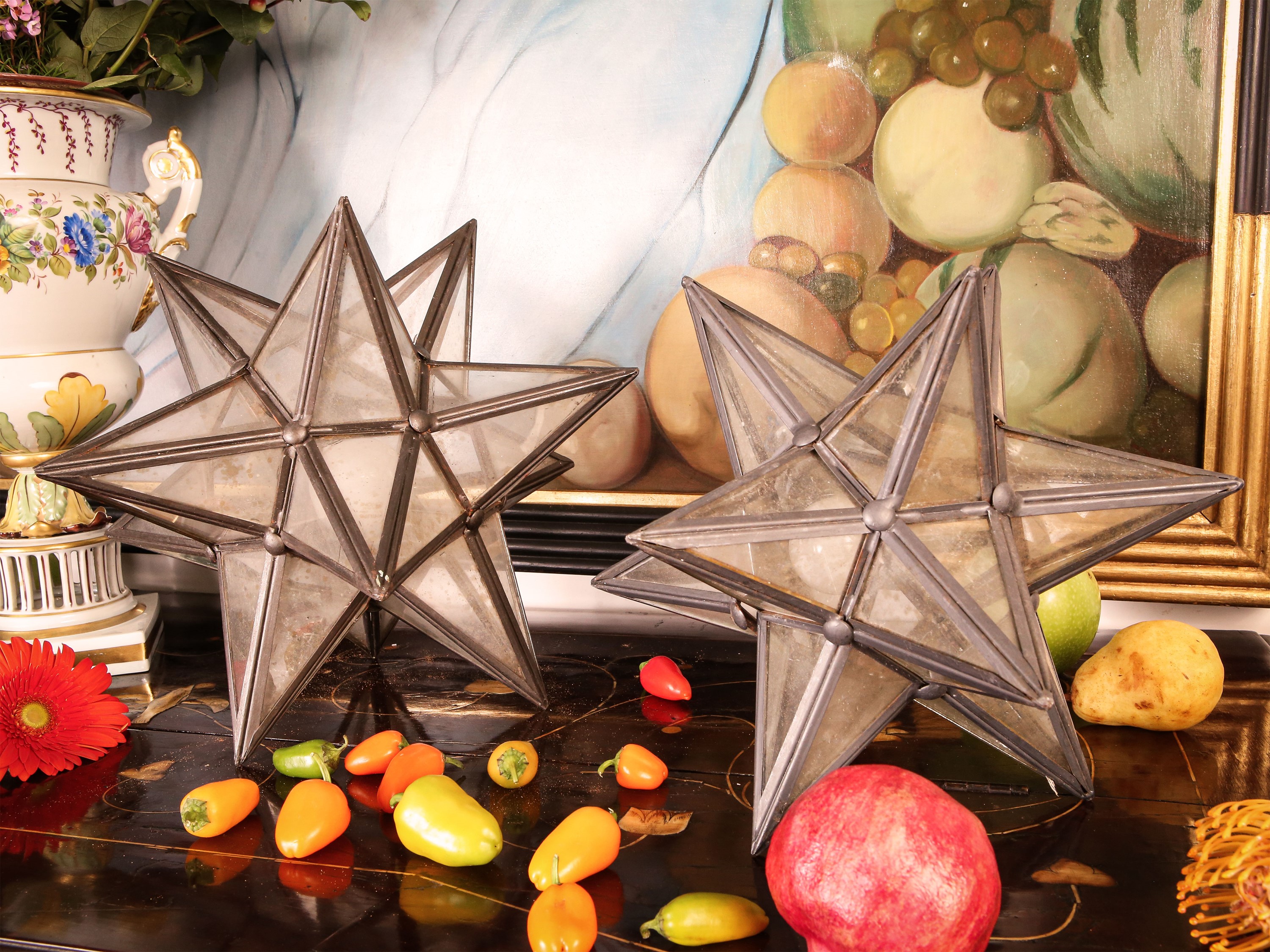 Coppia di lanterne a foggia di stella in vetro e metallo