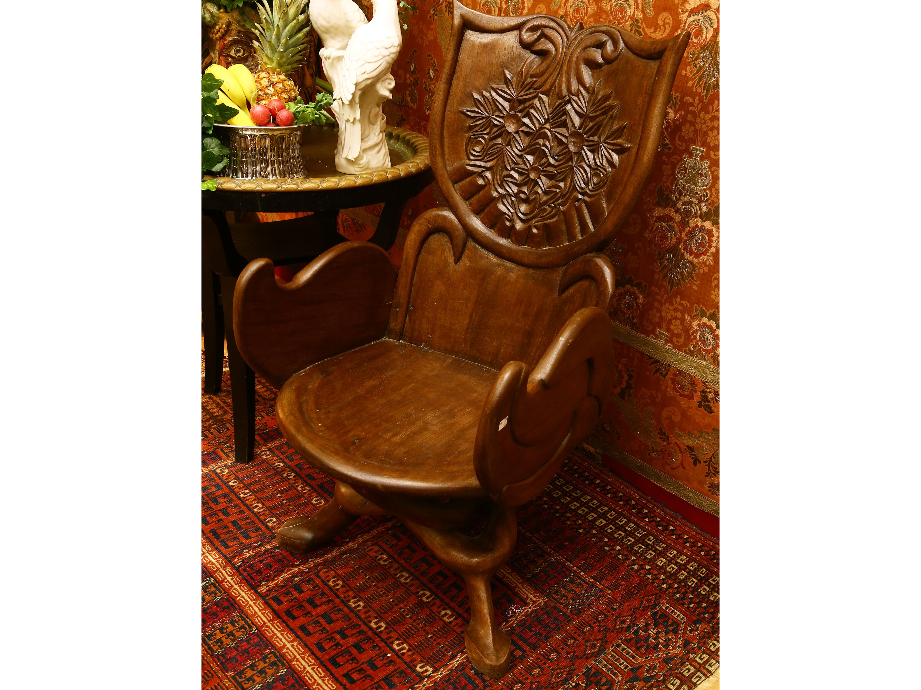 XX secolo schienali a foggia di scudo che ricordano una testa di gufo stilizzato, intagliati a motivi floreali, braccioli sagomati come ali, tre gambe intrecciate come un nodo, piedi a padella, alcuni difetti