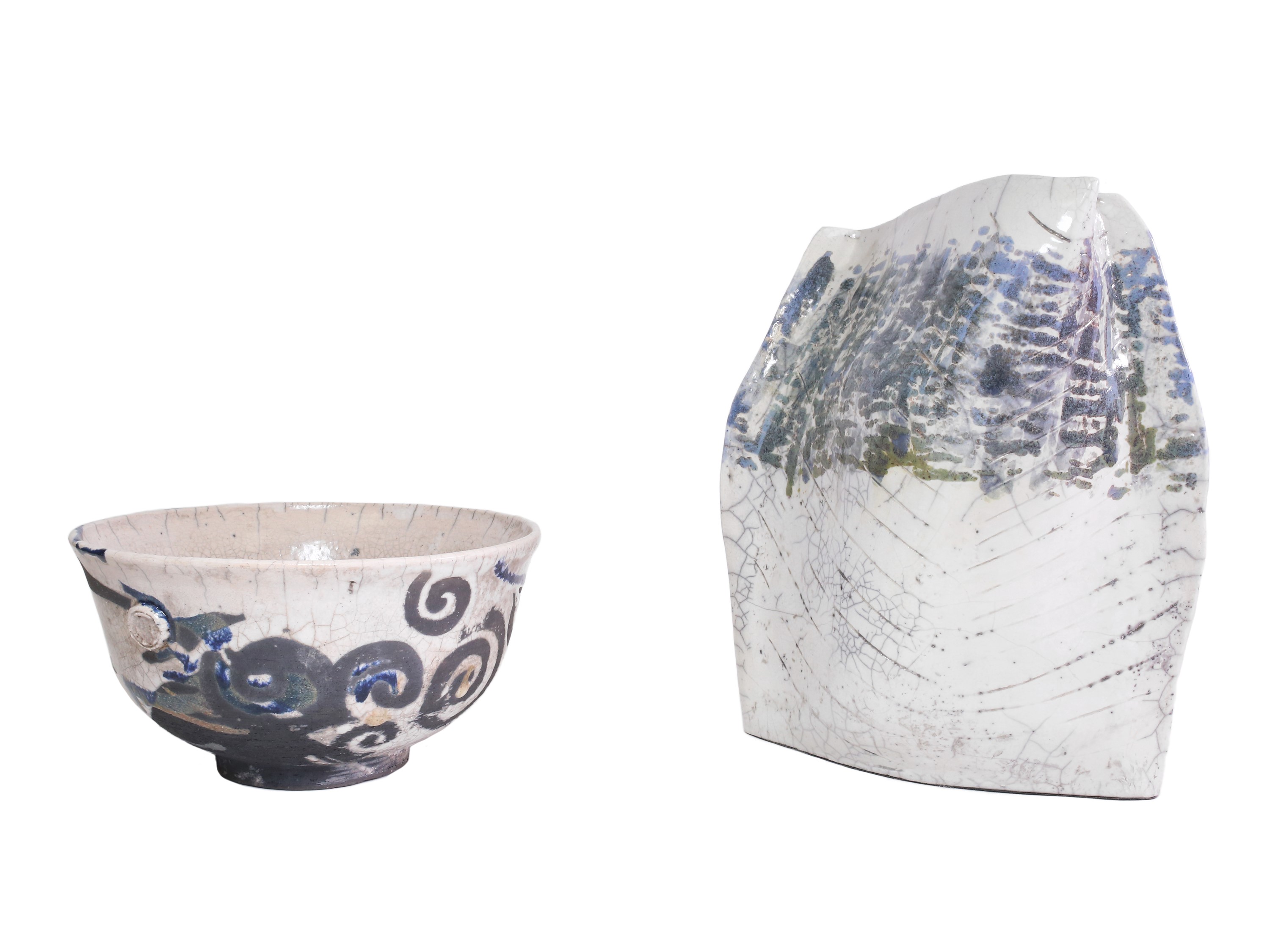 uno a ciotola decorato nei toni del rosa e del blu, l'altro nei toni del beige e del verde