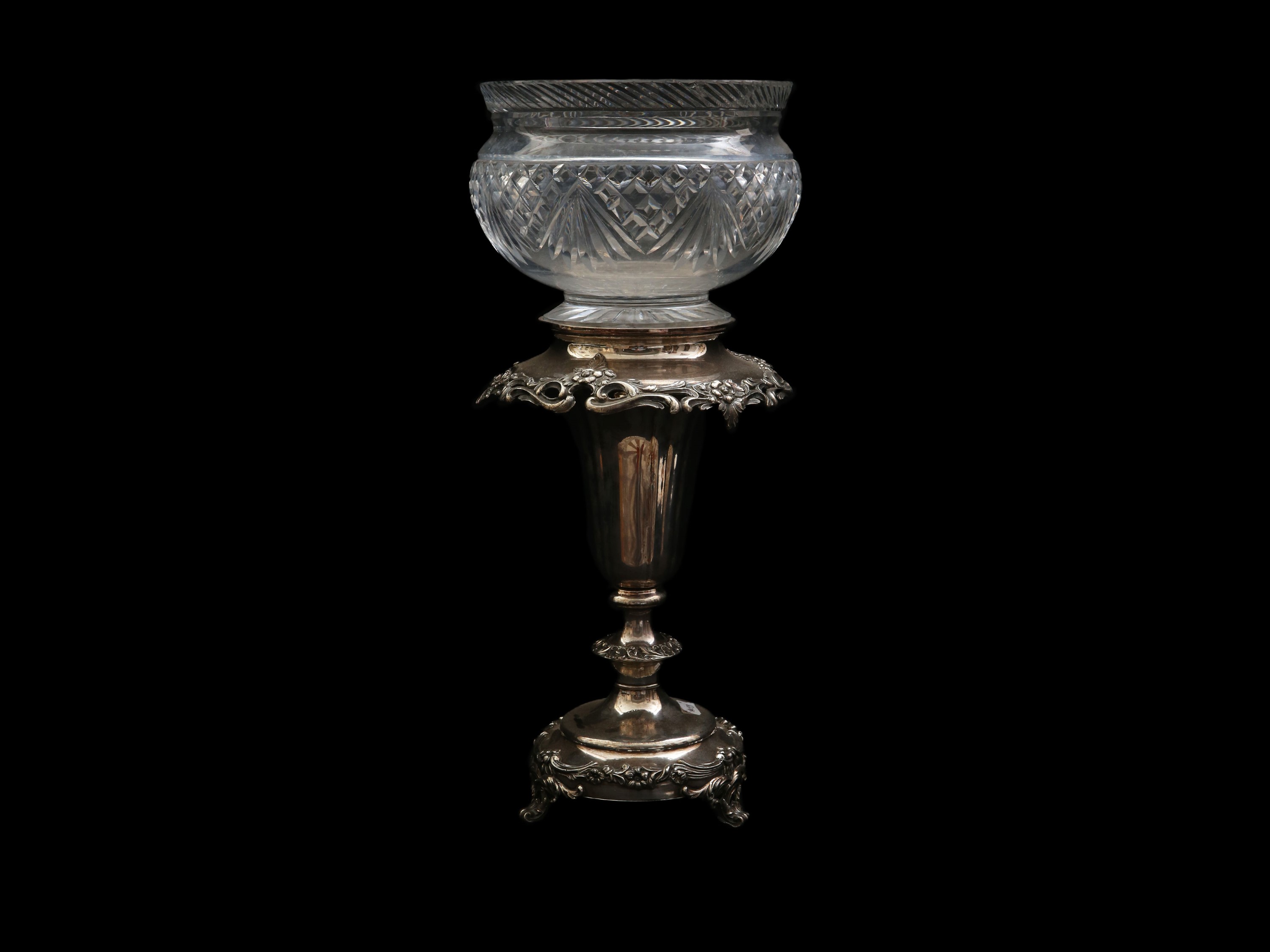 Grande fioriera centrotavola in metallo argentato e cristallo