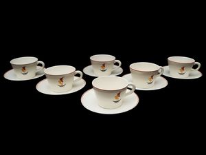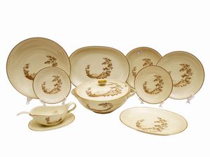decorato a scene campestri in monocromia color tabacco, bordo lumeggiato in oro, composto da 36 piatti piani, [..]