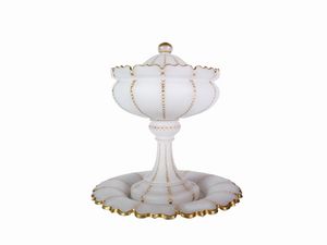 h cm 17 Murano, XX sec. con inclusioni di avventurina poggiante su delfino in vetro lattimo. Danno alla coppa [..]