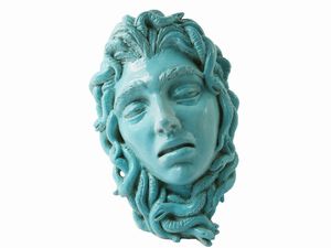 h cm 30x20x2 metà del XX secolo realizzata come una maschera ad altorilievo invetriata color verde acqua