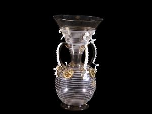 h cm 19 Murano, XIX sec. con manici rifiniti in lattimo e morise oro e avventurina applicate a caldo. Mancante [..]