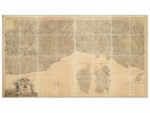 cm 109x192 seconda metà del XVIII secolo grande incisione applicata a tela, suddivisa in segmenti, in cornice, [..]