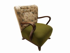 h cm 98 prima metà del XX secolo schienale avvolgente, gambe lievemente a sciabola, rivestite in tessuto a motivi [..]