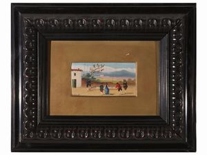 cm 5x9 XX secolo quattro miniature dipinte ad olio su tavoletta, firmate, in cornici ebanizzate, lievi difett [..]