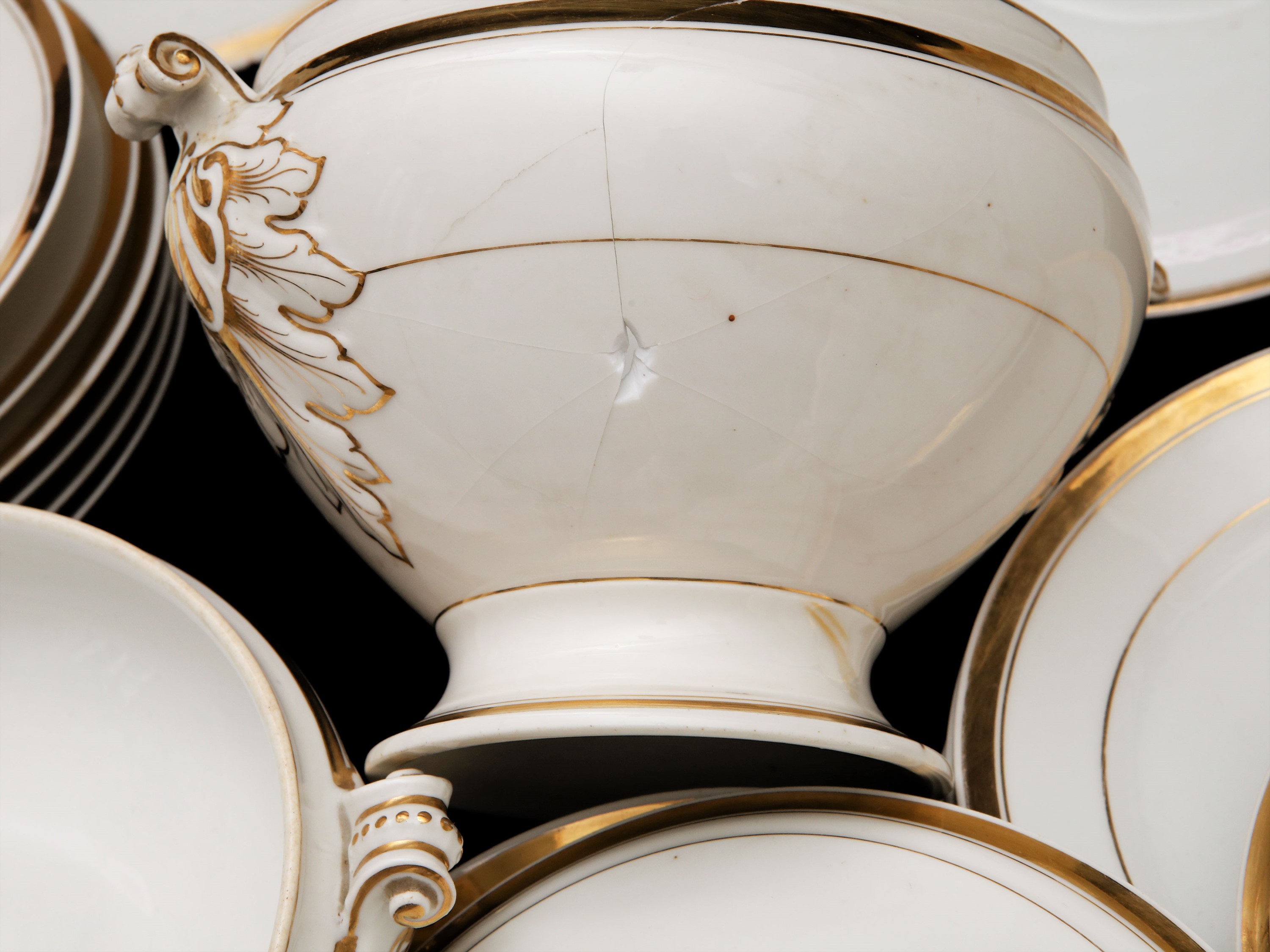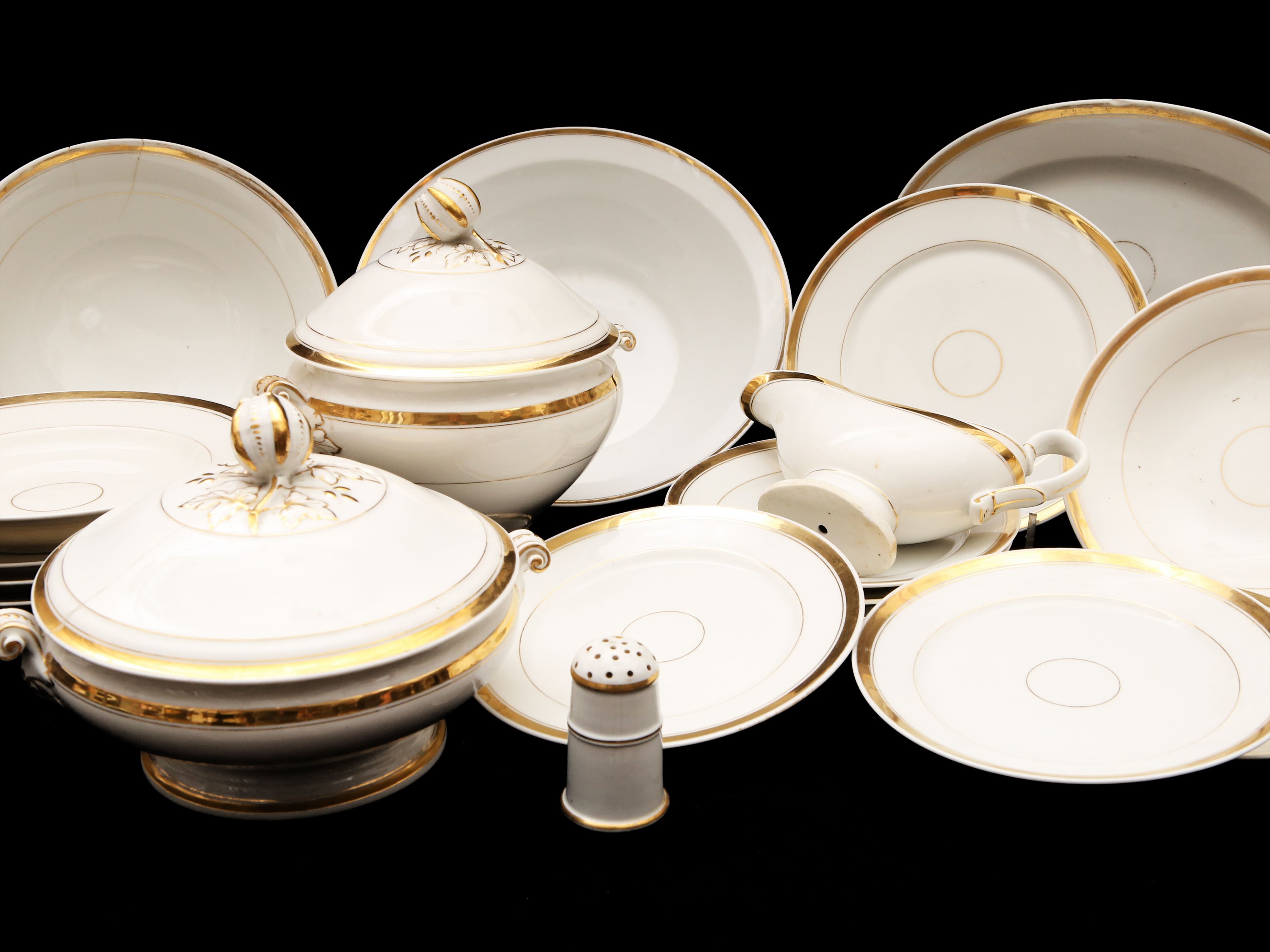 Francia, seconda metà XIX secolo di gusto impero, bordi lumeggiati in oro, composta da tre vassoi ovali a scalare, due insalatiere, due zuppiere, una salsiera, una pepiera, due alzate, sei piatti da dolce, un piatto fondo, sei piatti piani, mancanze e rotture