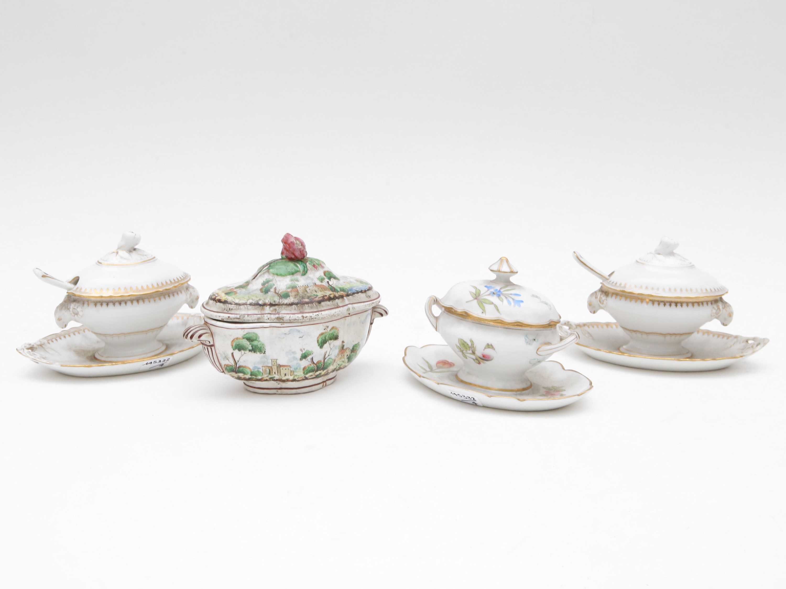 XIX secolo di cui una coppia con cucchiaino, prese a foggia di testa di ariete, una in maiolica dipinta con vedute (alcuni difetti) ed una Ginori
