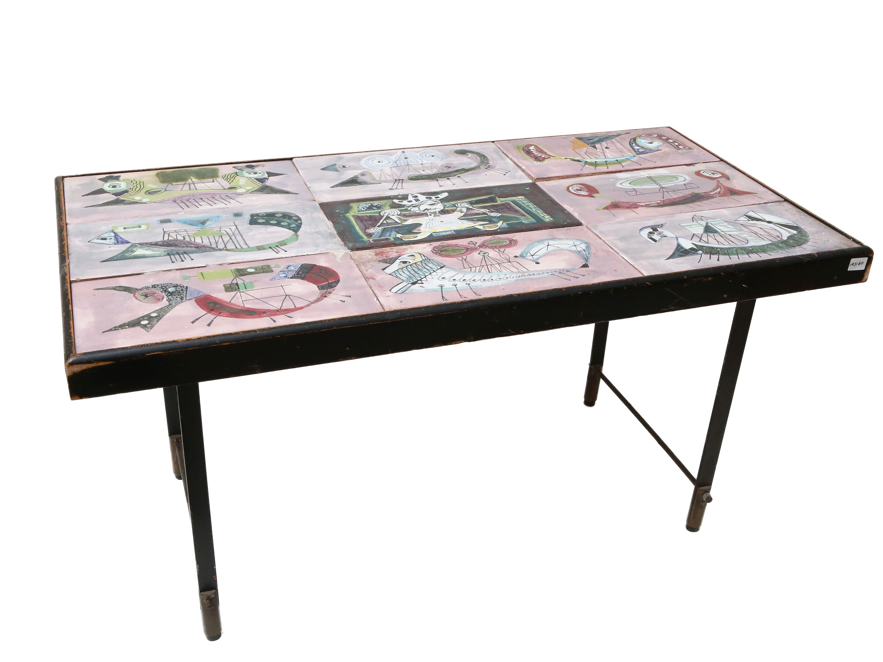 Anni Cinquanta piano realizzato con nove piastrelle in ceramica smaltata rosa e dipinte con figure zoomorfe, alcuni difetti