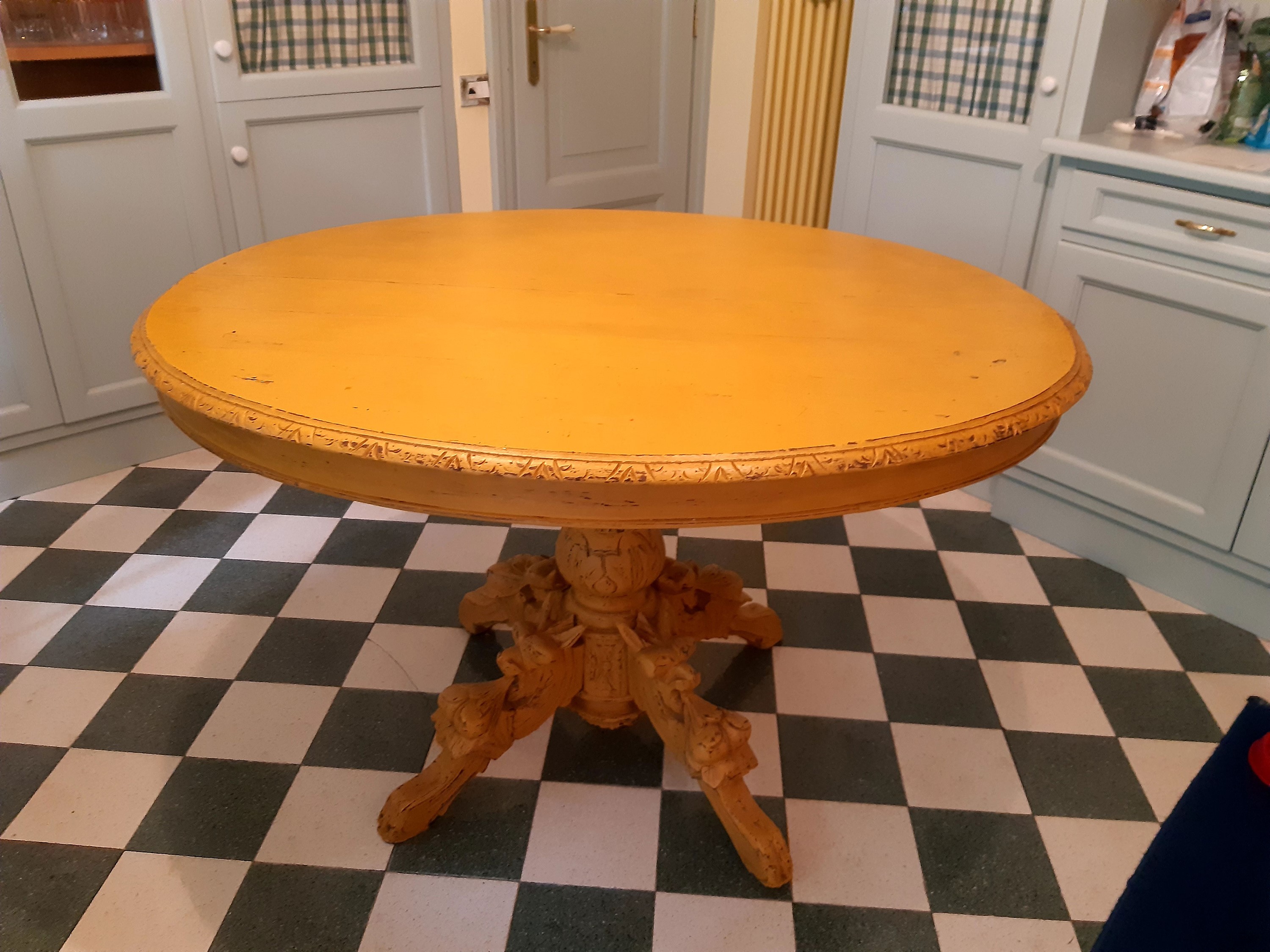 inizio del XX secolo piano ovale con bordo intagliato a rosoni, fusto centrale su quattro piedi a grottesche, alcuni difetti
