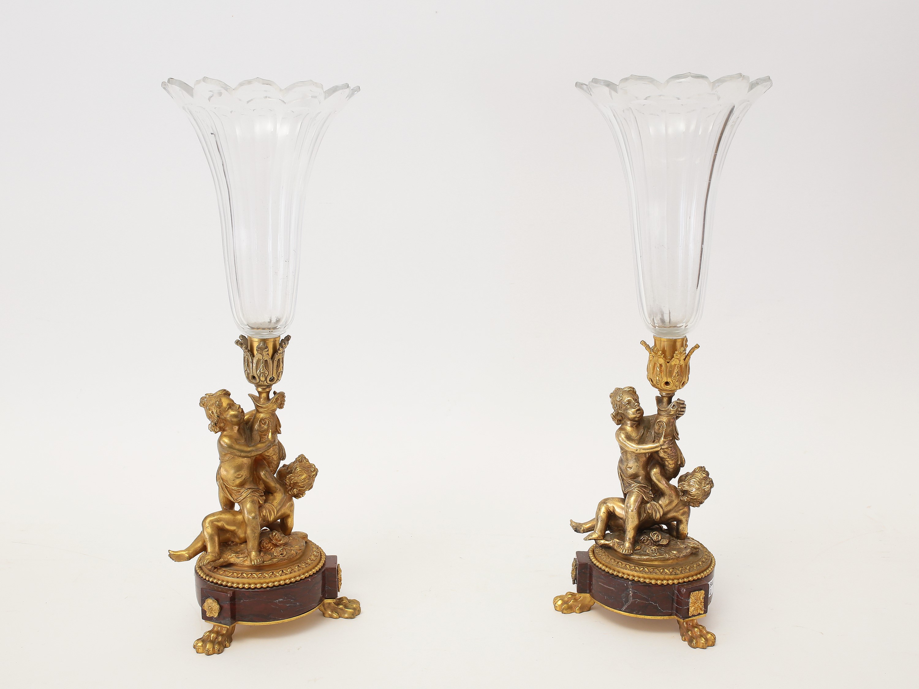 XX secolo coppa a tulipano sorretta da due putti intrecciati, base circolare in marmo su piedi ferini