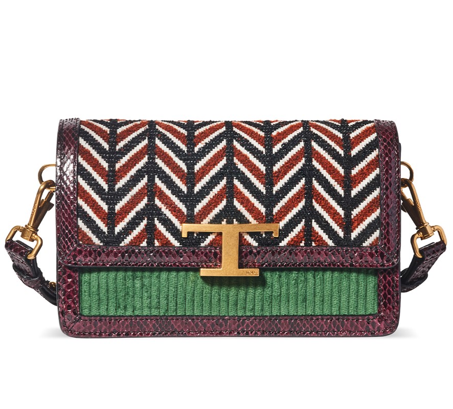 Borsa in tessuto spigato, velluto e pelle stampa rettile, con chiusura T in metallo e tracolla regolabile e removibile.
