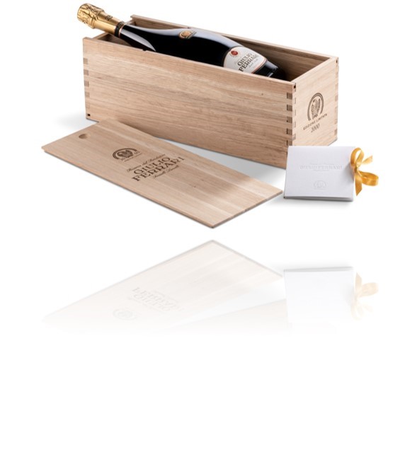 Giulio Ferrari Riserva del Fondatore 2000 Trentino-Alto Adige 1 bt Mg - csl E Cassetta in legno da una bottiglia di Giulio 2000 ed. Limitata sboccatura recente in formato magnum, all’interno della confezione abbiamo il piacere di inserire un voucher per la visita della cantina per due ospiti e la tessera che dà l’accesso al club dei collezionisti
