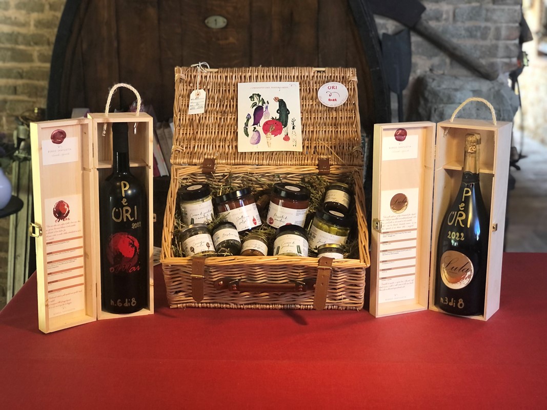 L’ORTO ED IL NETTARE DEL BORGO 1 valigetta di vimini contenente: 1 vasetto passata di pomodoro gr.360 1 vasetto datterini salsati gr. 370 1 vasetto zucchine a filetti sott’olio gr. 350 1 vasetto crema di zucchine gr. 200 1 vasetto crema di zucchine e mandorle gr. 200 1 vasetto basilico essiccato gr. 8 1 vasetto composta dia arance, mele e pepe gr. 90 1 vasetto composta di pere e zafferano gr. 90 1 vasetto di composta di cipolle rosse 1 vasetto carciofini sott’olio gr. 180 “Omai” 2015 - Igt Rosso della provincia di Pavia - 1 bt Mg “Lula” Oltrepò Pavese metodo classico Pinot Nero Docg millesimato 2017 - dosaggio zero - 1 bt Mg.