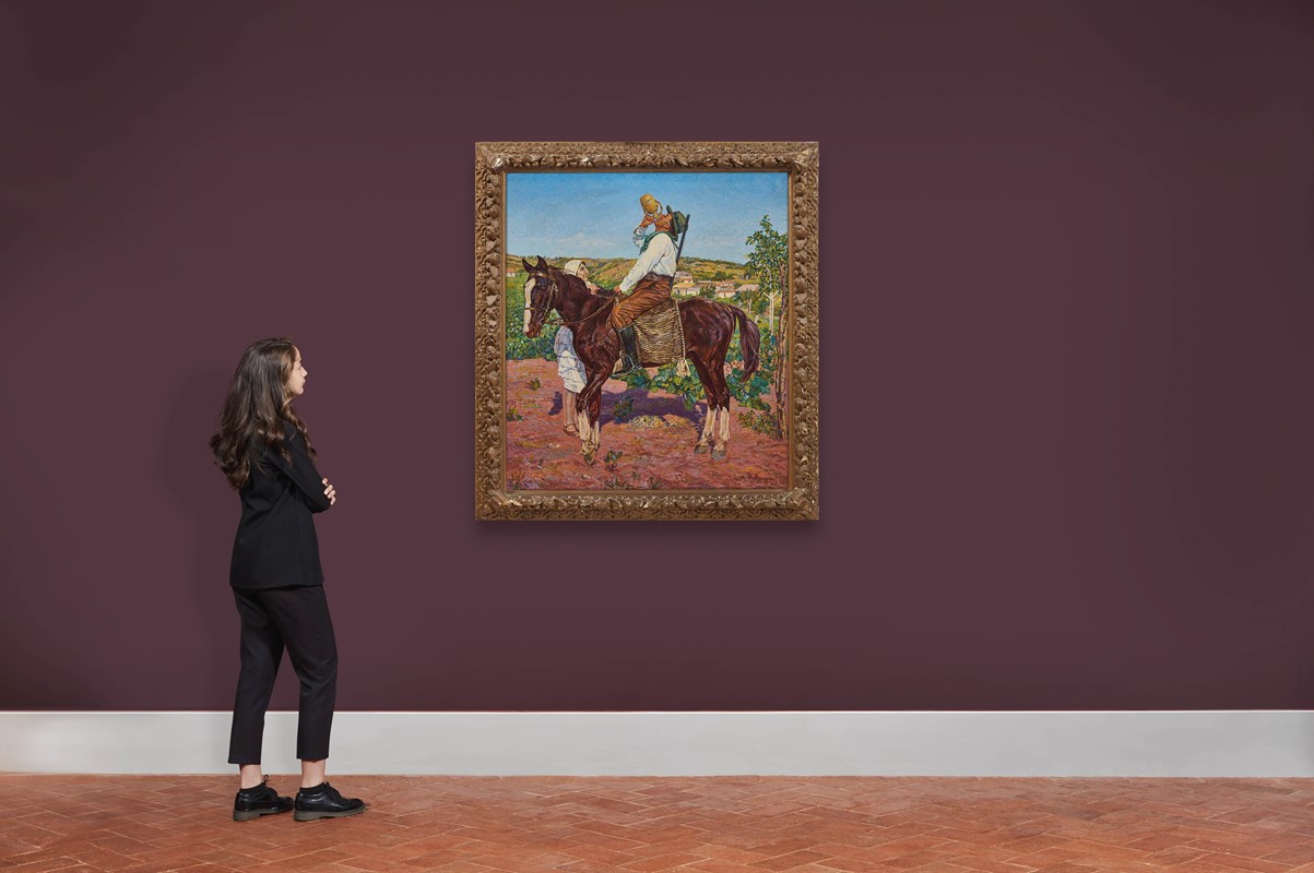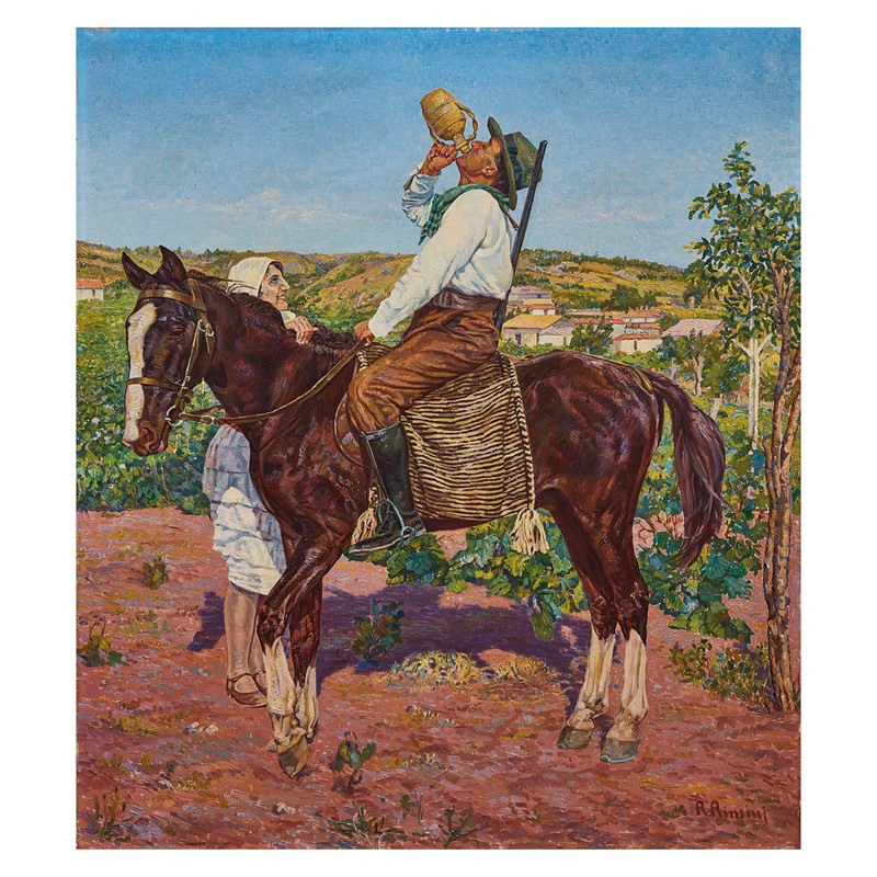 E a Venezia Rimini è tentato di tornare alla fine della primo conflitto mondiale, cui partecipa personalmente, ma l’amore per la propria terra è tanto inteso da non potervi rinunciare. È dalle intense suggestioni siciliane, con una predilezione per Taormina ed Acitrezza, che l’ispirazione dell’artista è pienamente appagata e l’occhio cattura la realtà che la circonda in uno straordinario connubio di analisi e sintesi di solenni forme e audaci accensioni cromatiche. È quel che possiamo osservare nel dipinto Sosta nella campagna siciliana presentato in catalogo, capace di evocare un’arcaica potenza mentre la materia cromatica sembra farci avvertire l’arsura e il calore del sole. L’opera, accostabile ad altre quali Aratura (1925), La trebbia (1928) e Al sole (1927), potrebbe essere ascritta alla seconda metà degli anni Venti.