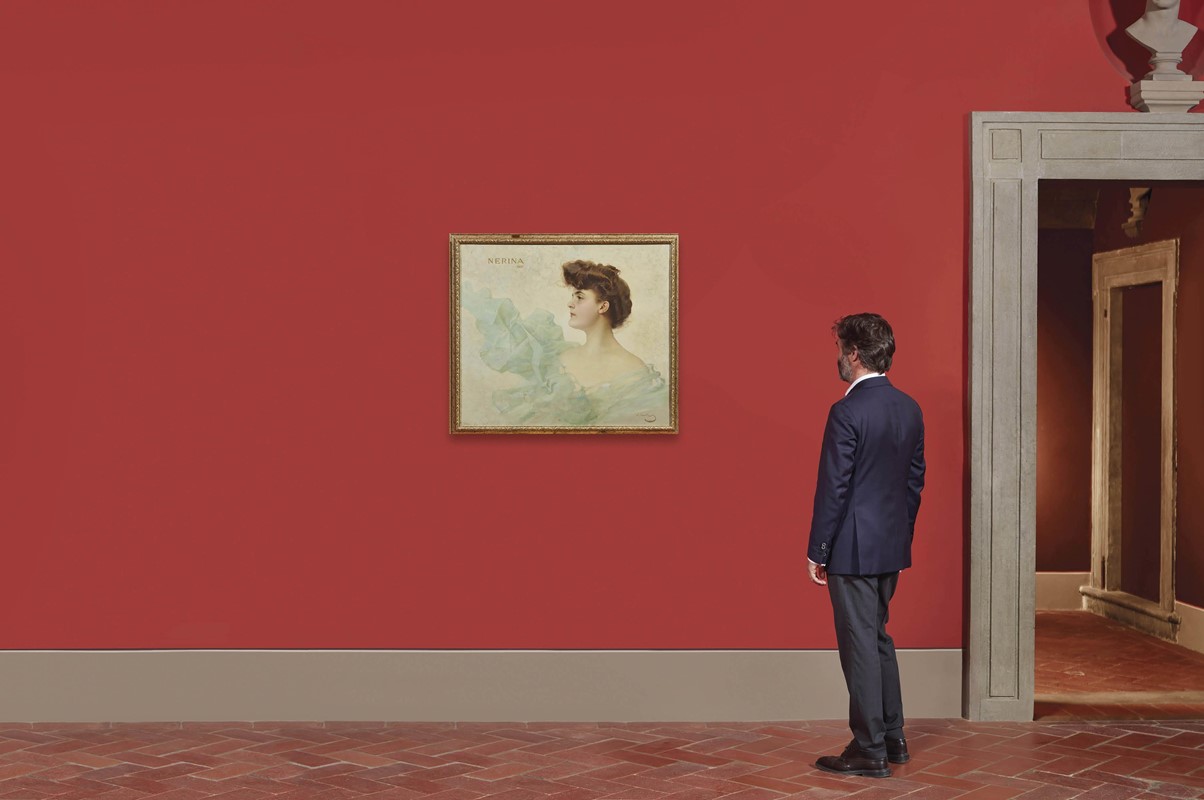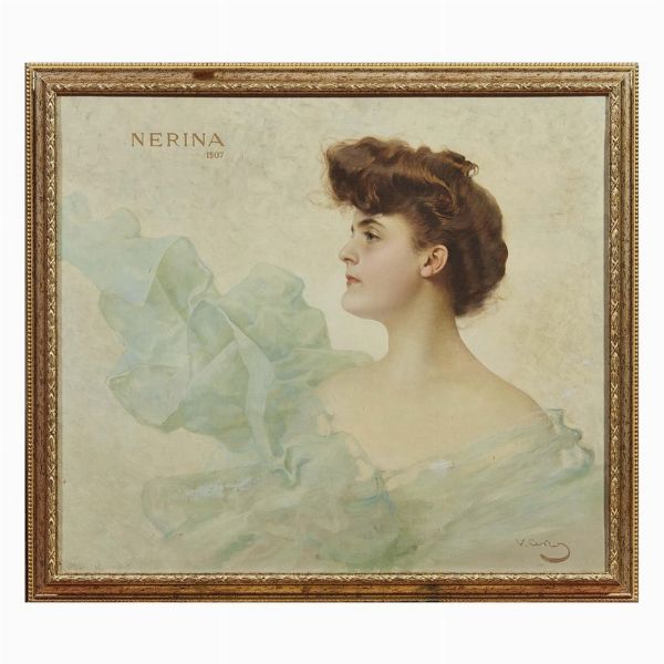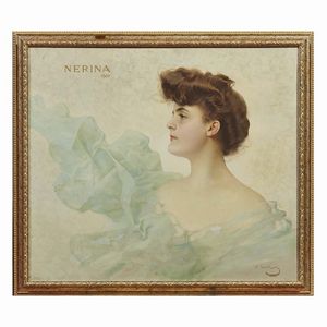 Il bel profilo di donna presentato in catalogo potrebbe certo essere annoverato tra le fanciulle «che hanno in sé qualcosa del fantasma e del fiore» (Cfr. G. Menasci, Vittorio Corcos, ritrattista, in “Fanfulla della Domenica”, 18 Febbraio 1894, p.3). Datato 1903, Nerina mostra un’affinità con opere quali il nobile profilo di Ada (1902) o Adriana (1897), con cui condivide anche l’elegante inserimento del nome in alto, ove i toni pastello cullano lo spettatore in una dolcezza onirica. Il serico incarnato è accarezzato da una luce soffusa e la chioma vaporosa orna il capo di Nerina mentre il velo, complice un’irreale brezza, si presta a un gioco decorativo che sembra evocare il profumo di un lilium appena schiuso.