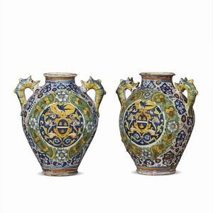 COPPIA DI ORCIOLI, MONTELUPO, SECONDA METÀ SECOLO XVI in maiolica dipinta in policromia con verde ramina, [..]