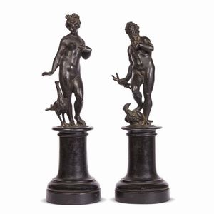 GIUNONE E ZEUS, BOTTEGA VENETA, FINE SECOLO XVI due sculture in bronzo, alt. cm 34 e 32, su base in legno tornito, [..]