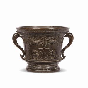 MORTAIO STEMMATO, VENEZIA, INIZI SECOLO XVI in bronzo, reca al centro uno stemma nobiliare (alla banda caricata [..]