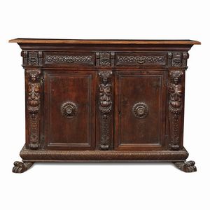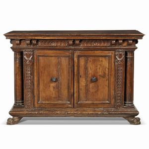 CREDENZA, TOSCANA, FINE SECOLO XVI in noce intagliato, piano aggettante sotteso da fascia ornata da elementi intagliati [..]