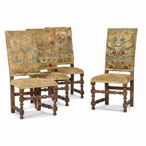 QUATTRO SEDIE, TOSCANA, FINE SECOLO XVII in noce, lo schienale e la seduta rivestiti in tessuto ricamato a motivi [..]