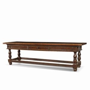 GRANDE TAVOLO, EMILIA, SECOLO XVII in noce, piano rettangolare aggettante sotteso da fascia sformellata centrata [..]