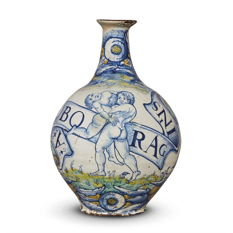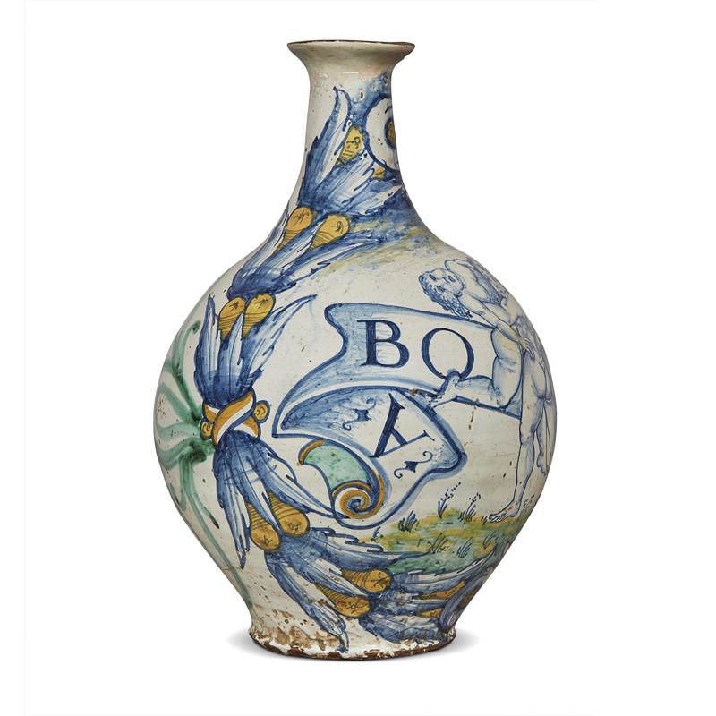 La fiasca appartiene a un fornimento farmaceutico dipinto con scene allegoriche e mitologiche e iscrizioni apotecarie, di cui alcuni vasi sono conservati al museo del Louvre e altri, con variazione nel decoro ma simile morfologia, sono conservati nei principali musei.