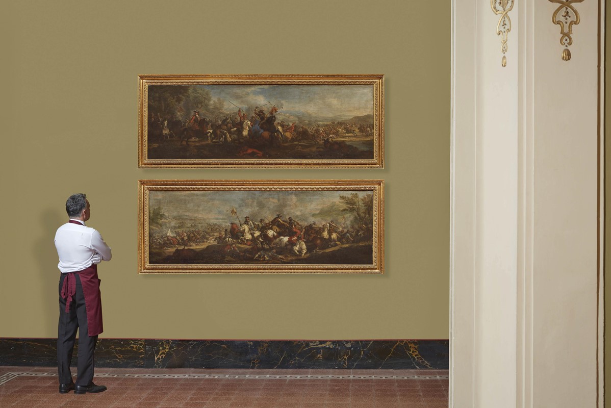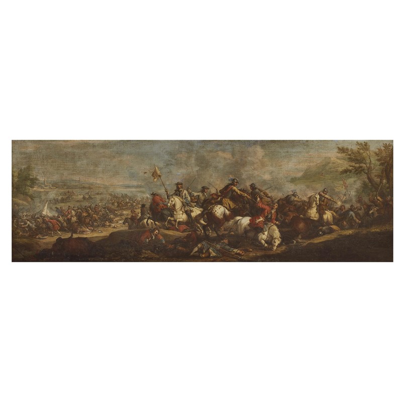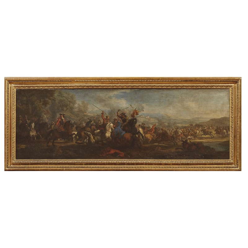 Simili per dimensioni alla coppia di battaglie a Roma nella collezione Pallavicini, le tele qui presentate possono accostarsi, per qualità oltre che per formato, alla coppia (Scontro di cavalieri; Dopo la battaglia) nelle Gallerie fiorentine, dalla collezione Feroni, riferite a “Monsù Leandro” da un cartellino di collezione al retro (M. Chiarini, Battaglie. Catalogo della mostra, Firenze 1989, p. 92, nn. 33-34).