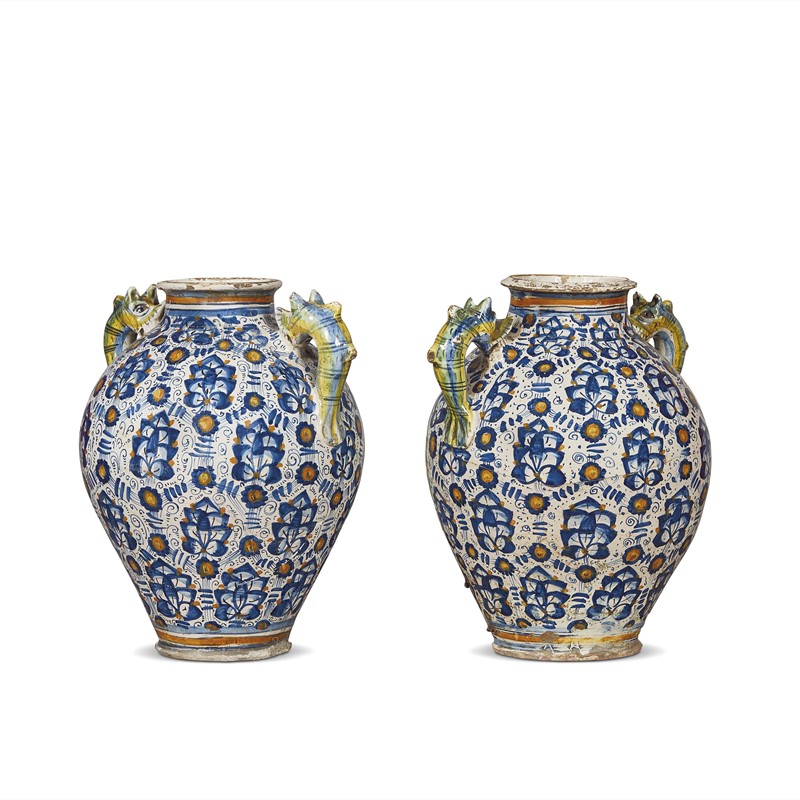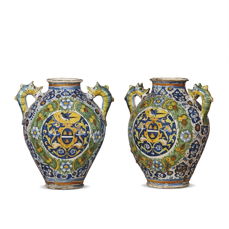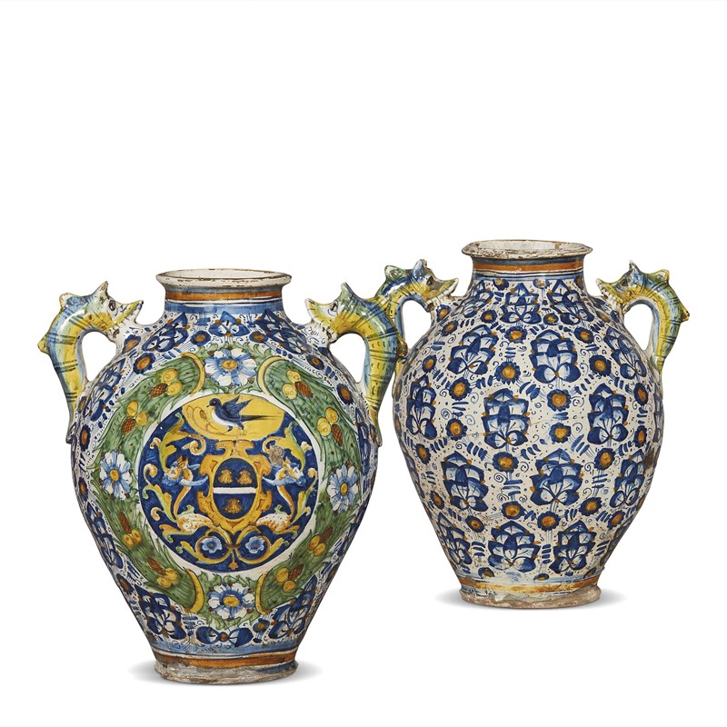 Gli orcioli appartengono a un contesto farmaceutico nobiliare laico e trovano puntuale riscontro in orcioli simili prodotti con successo duraturo dalle botteghe di Montelupo. I due contenitori, pur nell’alternanza tra alcuni dei principali ornati della manifattura di Montelupo e forme coerenti, ma con varianti morfologiche, trovano riscontro in particolare nella decorazione del medaglione centrale in vasi apotecari prodotti per le principali spezierie toscane. Ad esempio la variante nella forma delle anse è coerente con alcuni orcioli della farmacia del convento di San Marco a Firenze, con medaglioni con ritratti di Santi. Ma la maggiore vicinanza nel progetto dell’impianto decorativo si riscontra invece nell’orcio ora conservato nella Galleria di Palazzo Cini a Venezia, già della collezione Pringsheim, prodotto per una farmacia laica e pubblicato da Carmen Ravanelli Guidotti, unitamente a due esemplari molto simili recentemente transitati sul mercato londinese (Sotheby’s, From Earth to Fire, Londra 1 novembre 2018, lotto 622), che condividono con il nostro il decoro a “palmetta persiana”, ma anche la presenza di grottesche con figure mostruose barbate, lì a circondare l’emblema della famiglia Stepazola di Verona. Tutti questi confronti sono databili tra il 1545 e il 1580 circa, arco temporale che riteniamo conforme per la coppia qui presentata.