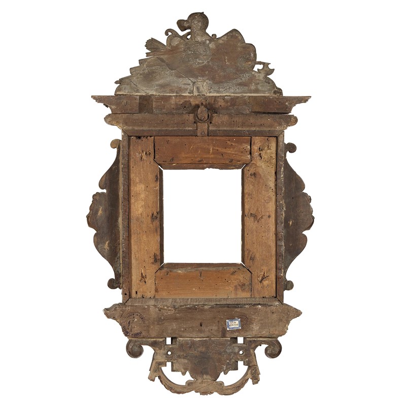 in noce intagliato e scolpito con lumeggiature in oro, battuta liscia sale su più ordini di fasce intagliate a baccellature e piccoli tondini di forma architettonica, sormontata da cimasa con baccellatura estroflessa e lumeggiata d’oro, sotto gola interamente decorata a motivi di rosette entro dadi, sovrastata da intaglio a foggia di ricca panoplia centrata da medaglione con mascherone. I lati sono impreziositi da volti di cherubino di profilo centrati da ali disposte a formare volute. La parte inferiore presenta mensola lavorata a foglie di quercia e nella parte sottostante con decoro a embricazioni, chiusa al centro da mascherone intagliato dalla cui bocca si dipartono due festoni che salgono ai lati; ingombro cm 79,5x47,5, luce cm 21,2x18,2
